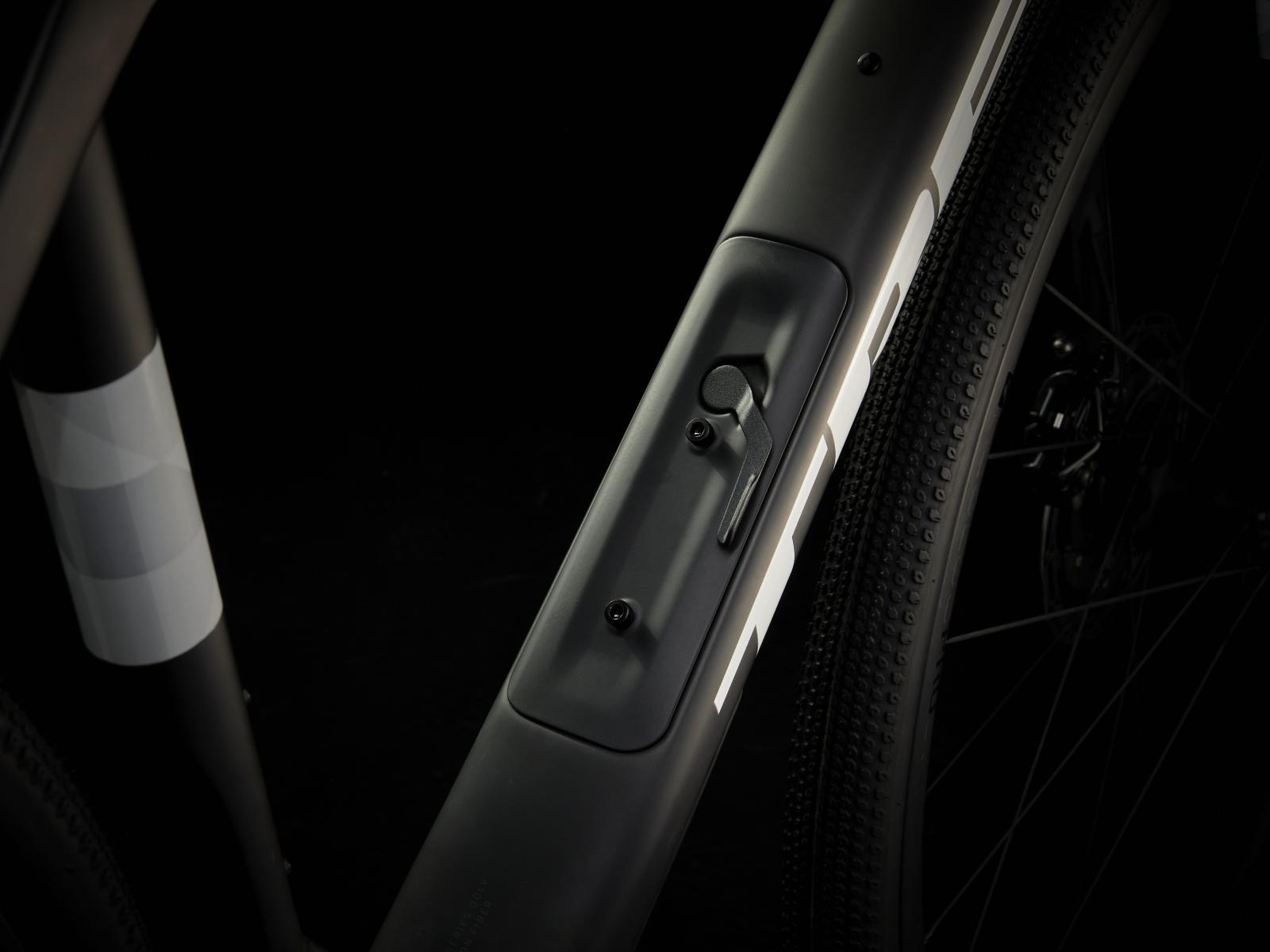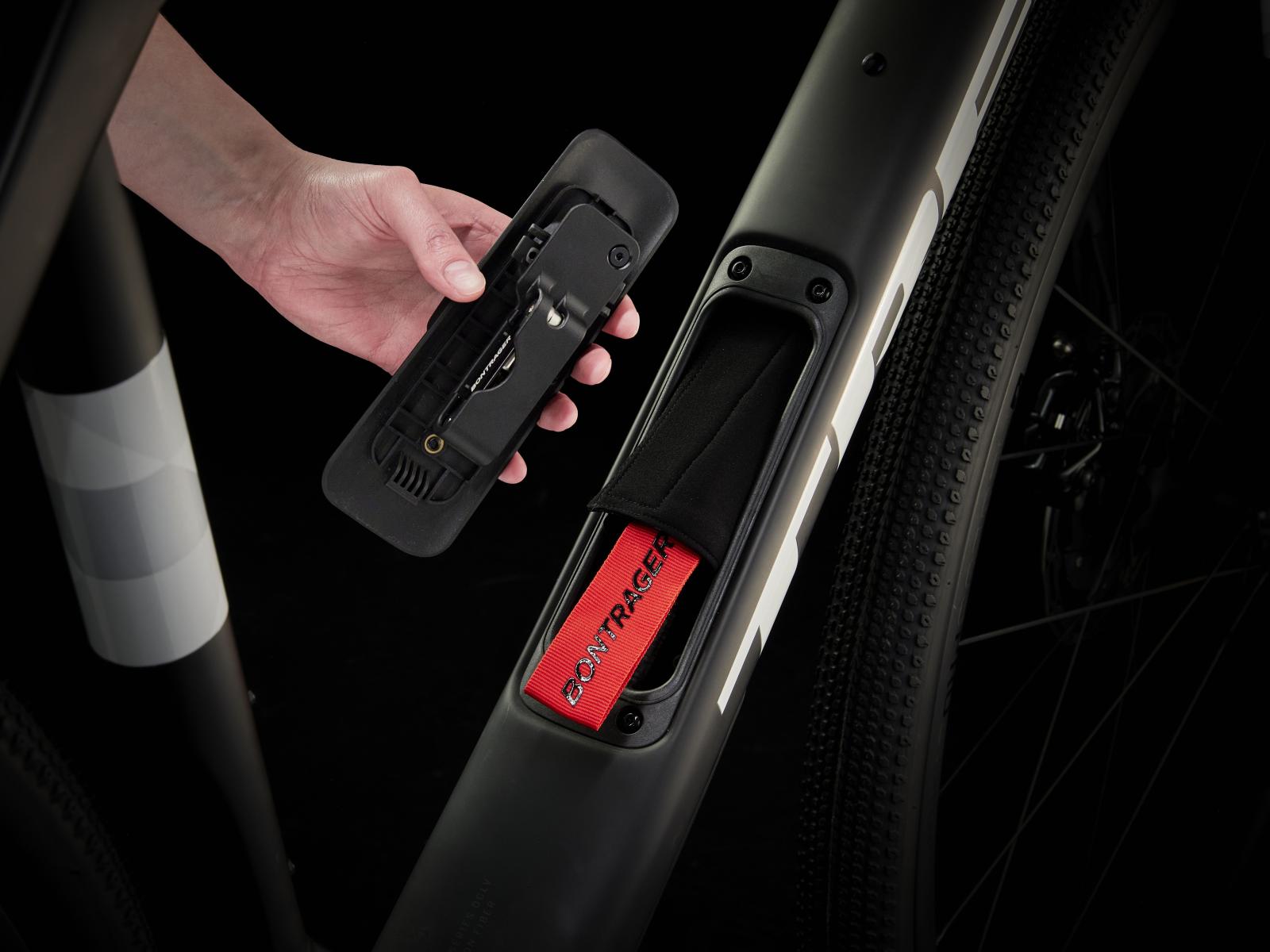 Ein ins Unterrohr integriertes Staufach nimmt Werkzeug und Ausrüstung sicher auf.