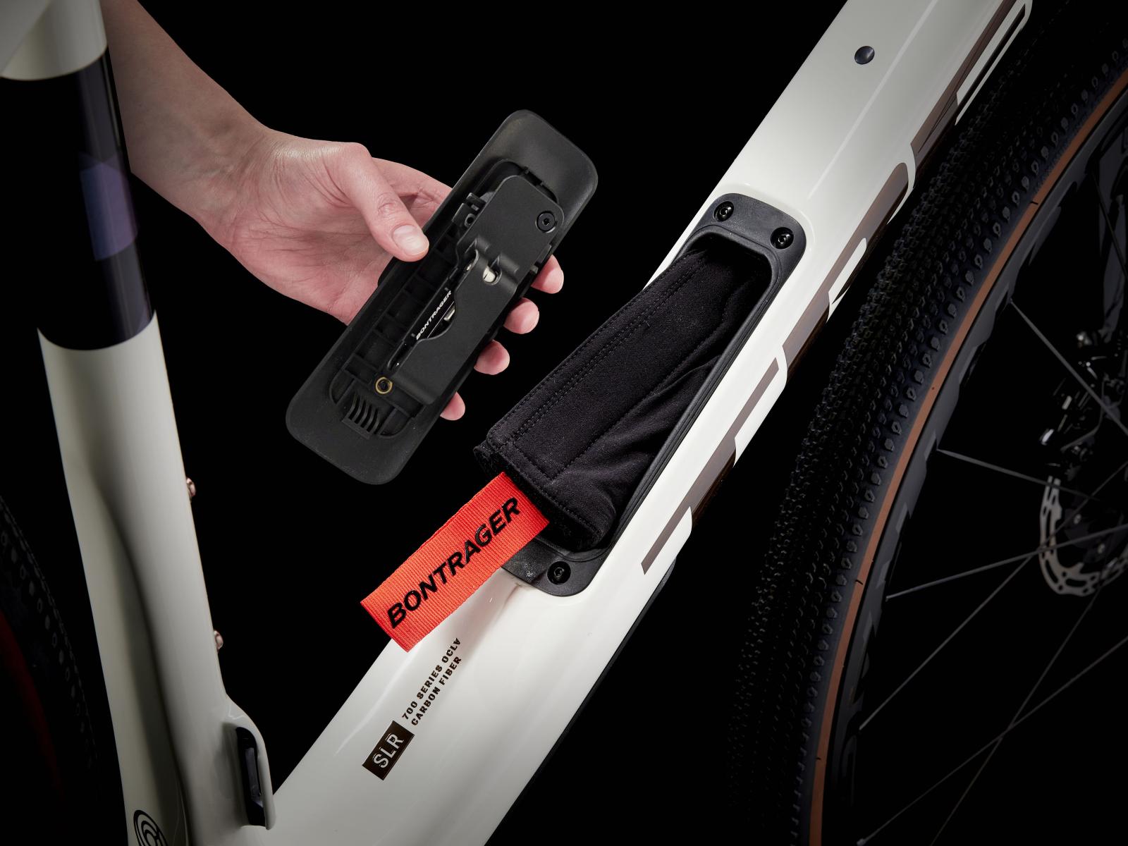 Ein ins Unterrohr integriertes Staufach nimmt Werkzeug und Ausrüstung sicher auf.