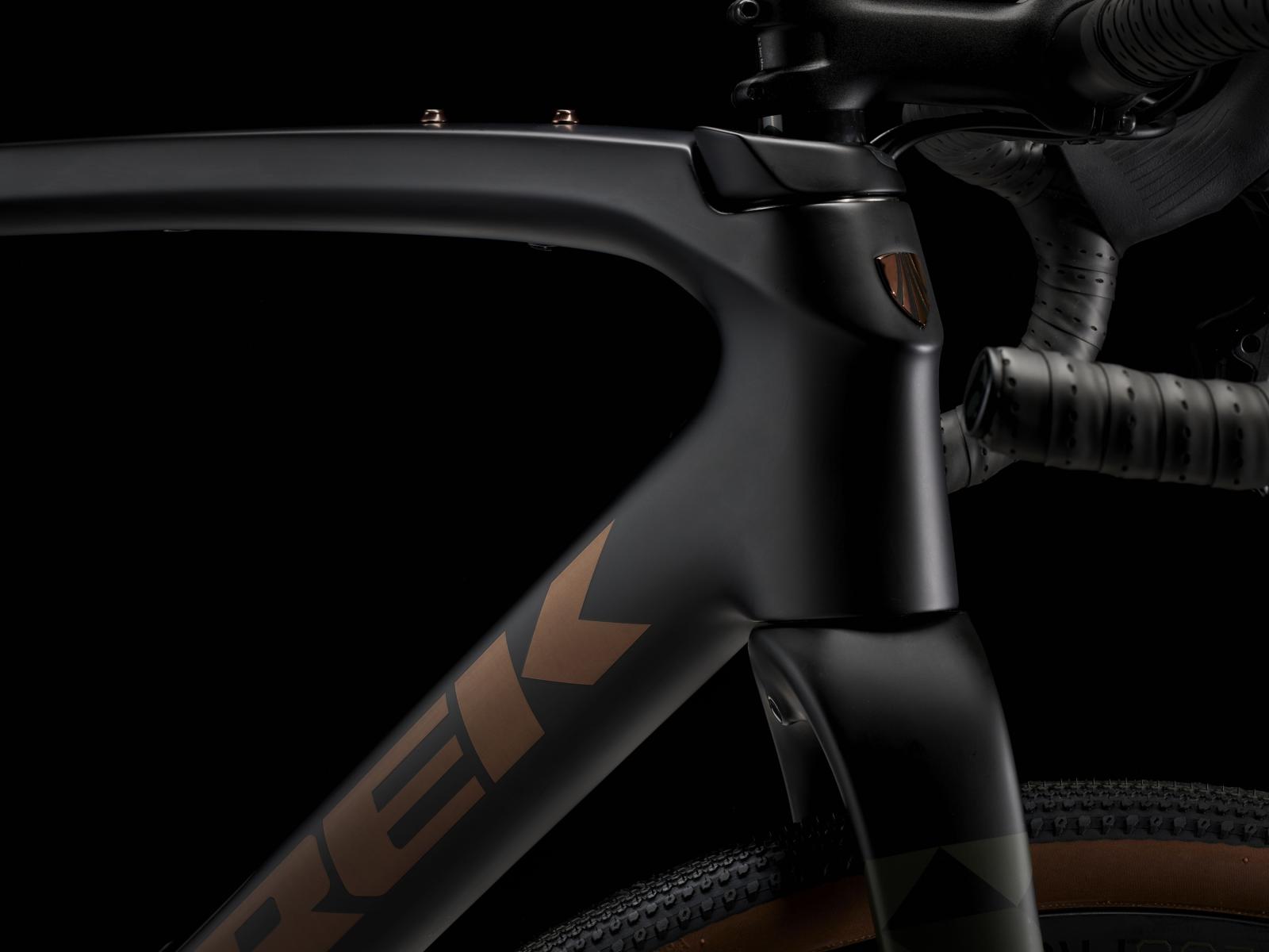 Einen Rahmen aus 700 Series OCLV Carbon mit vorderem IsoSpeed und Carbon Armor, eine progressive Geometrie, die bei hohen Geschwindigkeiten stabil und auf knackigen Anstiegen effizient ist, ein internes Staufach, verborgene Züge, die deinen Taschen nicht in die Quere kommen, und integrierte Aufnahmepunkte für eine Rahmentasche und Schutzbleche. Dazu bekommst du eine Carbongabel, SRAMs drahtlosen, elektronischen Force XPLR AXS D2 1x12-Antrieb mit breitem Übersetzungsbereich, Bontragers Aeolus Pro 3V-Laufräder aus OCLV Carbon und breite Gravelreifen im Format 700 x 40C für zusätzliche Stabilität und Traktion. Der Rahmen bietet Pla