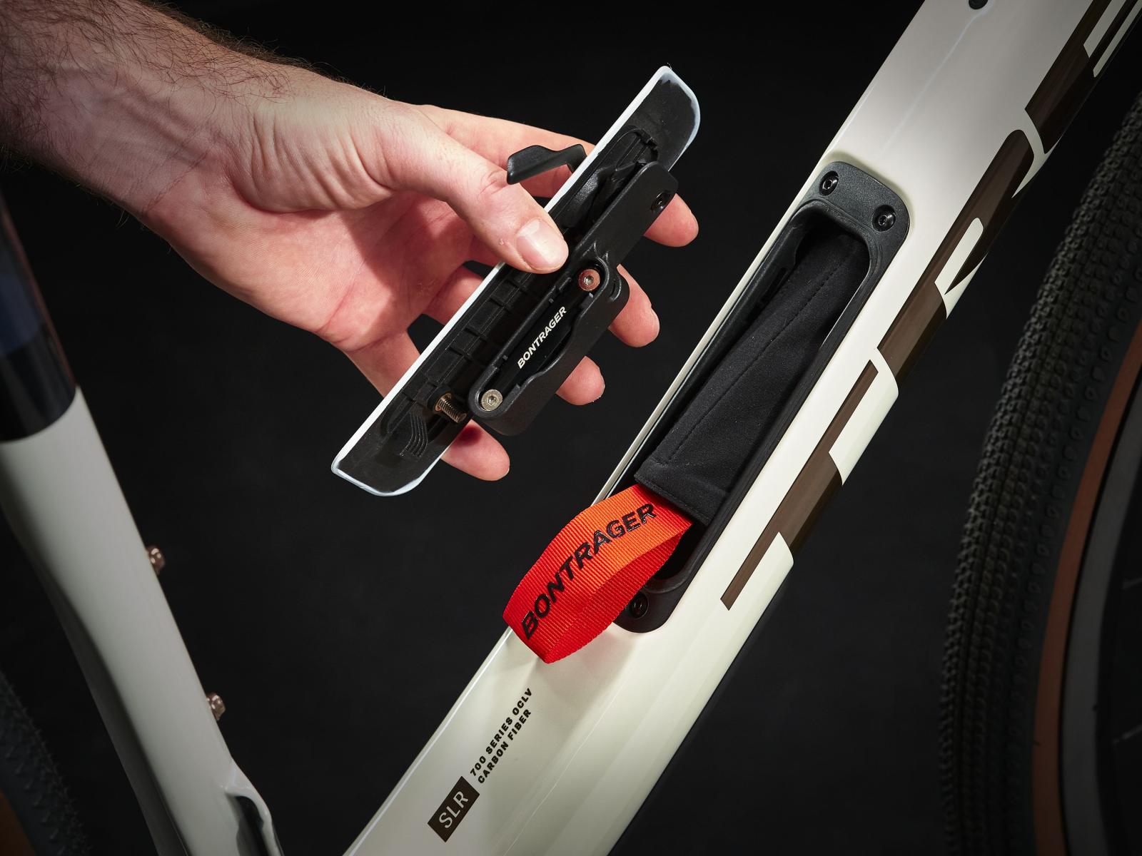 Ein ins Unterrohr integriertes Staufach nimmt Werkzeug und Ausrüstung sicher auf.