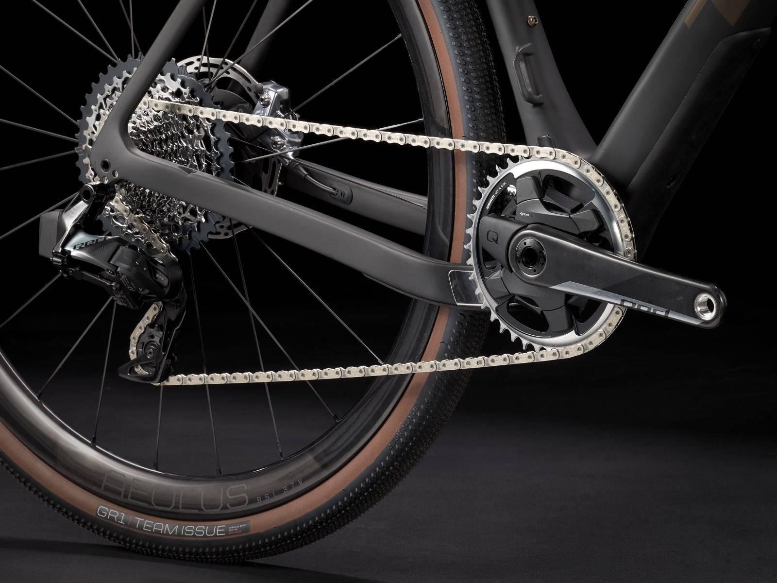 Einen Rahmen aus 700 Series OCLV Carbon mit IsoSpeed und Carbon Armor und mit einer progressiven Geometrie, die bei hohen Geschwindigkeiten stabil und auf knackigen Anstiegen effizient ist. Dazu gibts ein internes Staufach, verborgene Züge, die deinen Taschen nicht in die Quere kommen, und integrierte Befestigungselemente für eine Rahmentasche und für Schutzbleche. Außerdem bekommst du eine Carbongabel, SRAMs drahtlosen, elektronischen RED AXS 1x12-Antrieb mit breitem Übersetzungsbereich, Bontragers Aeolus RSL 37V-Carbonlaufräder und breite Gravelreifen im Format 700 x 40C für noch mehr Stabilität und Traktion. Der Rahmen bietet