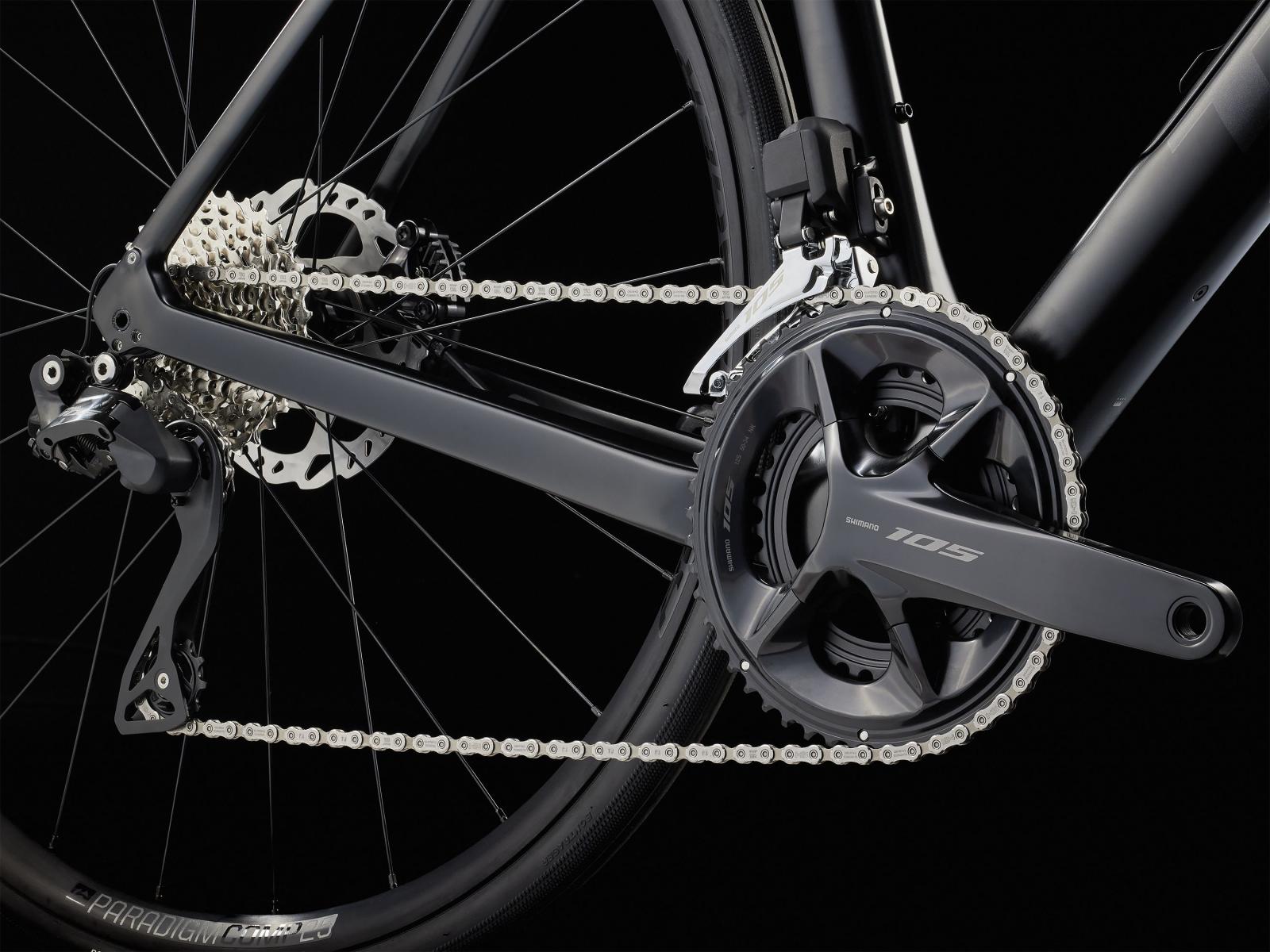 Einen Rahmen aus 500 Series OCLV Carbon mit vibrationsdämpfendem hinterem IsoSpeed, kraftvoll zupackende Flat Mount-Scheibenbremsen und einen drahtlosen, elektronischen Shimano 105 Di2 2x11-Antrieb. Dazu gibts Bontragers Paradigm Comp Tubeless Ready-Laufräder, ein integriertes Carboncockpit, ein internes Staufach und eine interne Zugführung, die allesamt zum enormen Potenzial und zum schlanken Look des Bikes beitragen. Dank Befestigungsmöglichkeiten am Oberrohr lässt sich für längere Ausfahrten eine Tasche ganz ohne Spanngurte oder Riemen sicher anbringen.