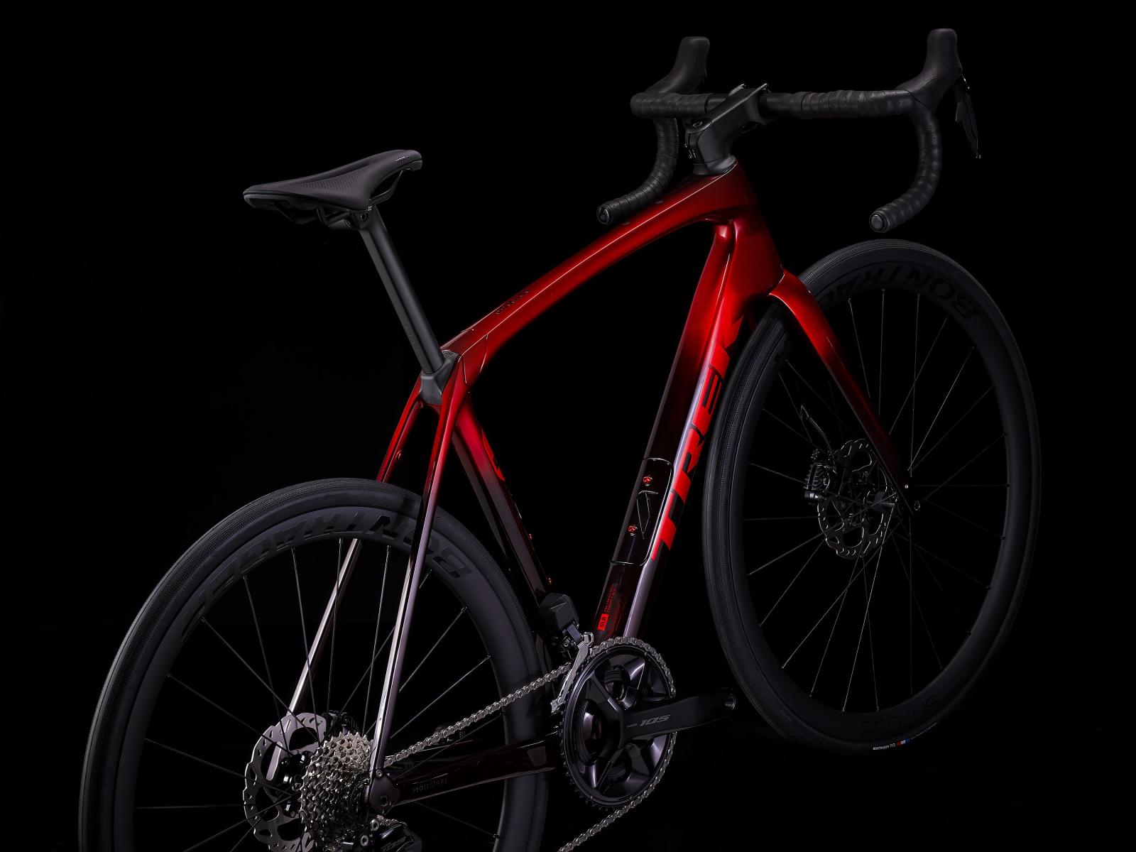 Einen Rahmen samt Gabel aus 800 Series OCLV Carbon mit hinterem IsoSpeed, internem Staufach und Befestigungsmöglichkeiten am Oberrohr. Ausgestattet ist es mit Shimanos drahtlosem, elektronischem 105 Di2 2x12-Antrieb, kraftvoll zupackenden Flat Mount-Scheibenbremsen, Aeolus Pro 37-Carbonlaufrädern und einem Bontrager Pro IsoCore-Lenker, der Straßenvibrationen im Vergleich zu herkömmlichen Carbonlenkern um 20 % verringert.