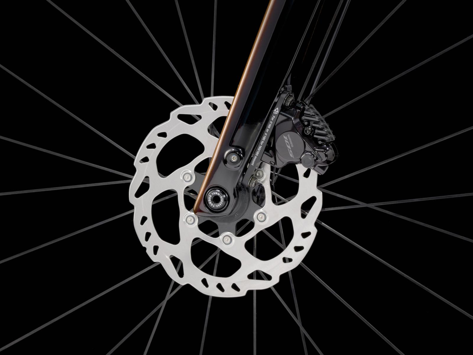 Einen Rahmen samt Gabel aus 800 Series OCLV Carbon mit hinterem IsoSpeed, internem Staufach und Befestigungsmöglichkeiten am Oberrohr. Ausgestattet ist es mit Shimanos drahtlosem, elektronischem 105 Di2 2x12-Antrieb, kraftvoll zupackenden Flat Mount-Scheibenbremsen, Aeolus Pro 37-Carbonlaufrädern und einem Bontrager Pro IsoCore-Lenker, der Straßenvibrationen im Vergleich zu herkömmlichen Carbonlenkern um 20 % verringert.