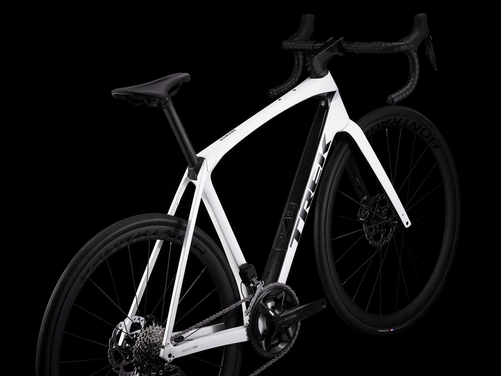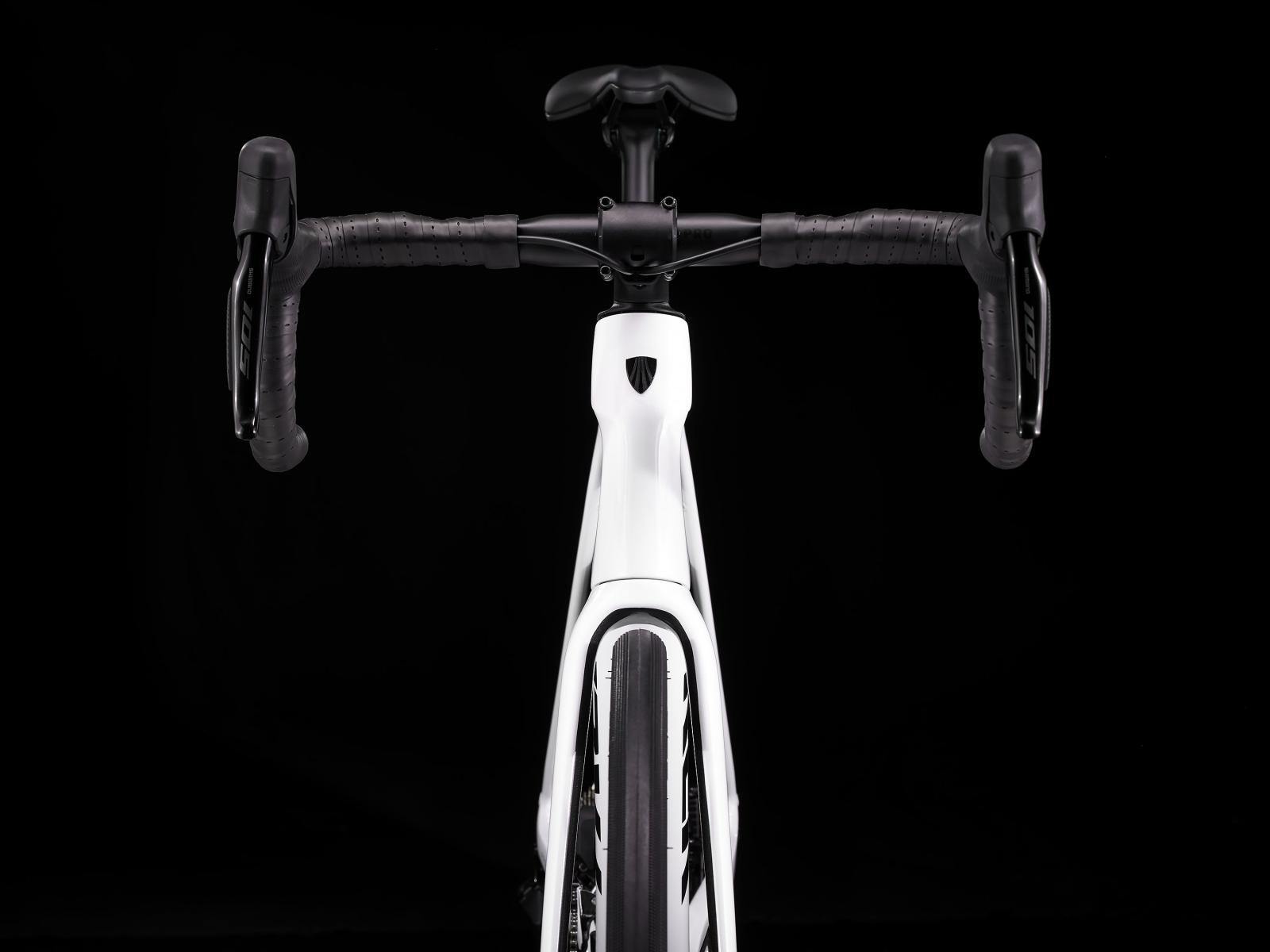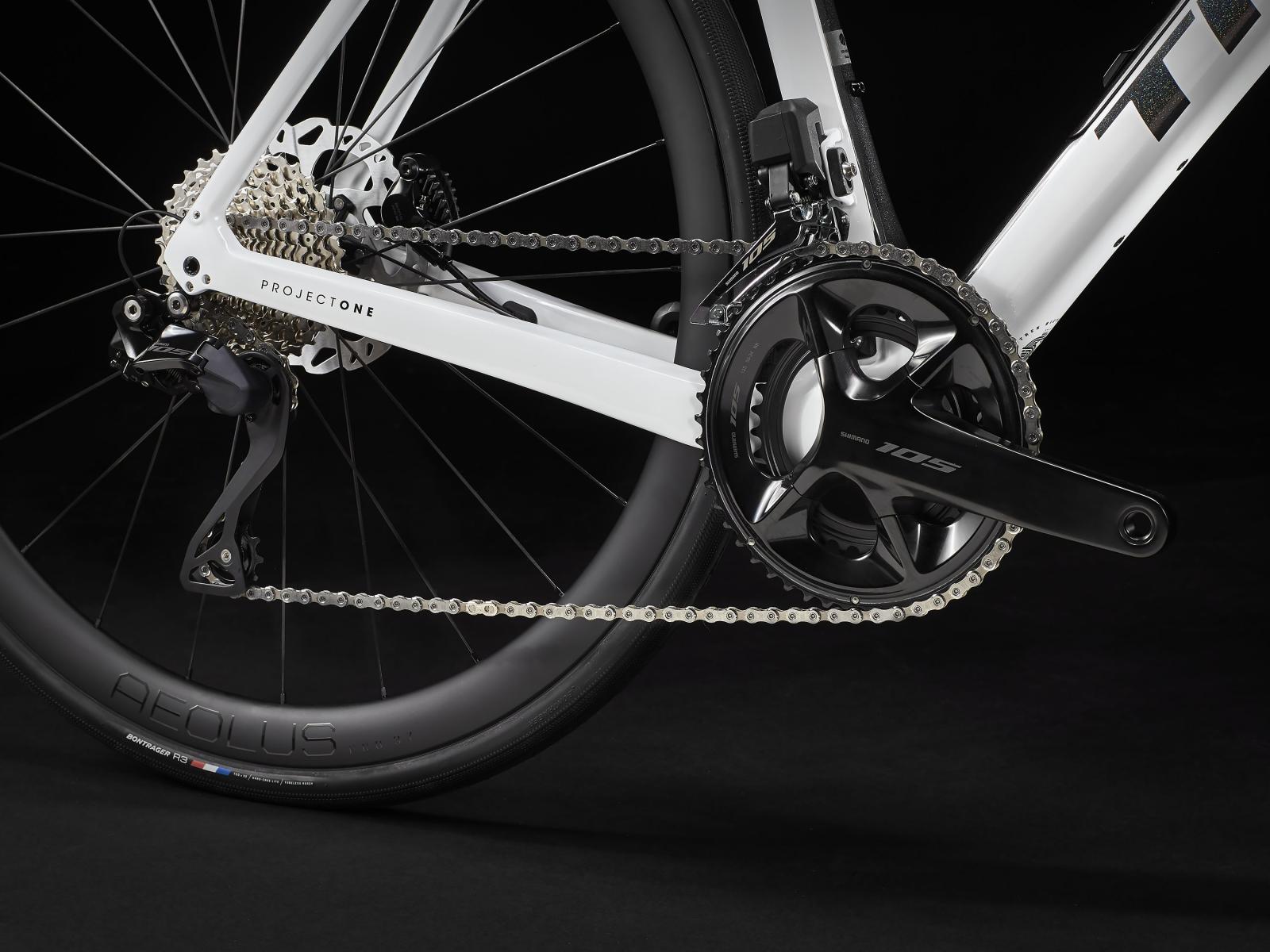 Einen Rahmen samt Gabel aus 800 Series OCLV Carbon mit hinterem IsoSpeed, internem Staufach und Befestigungsmöglichkeiten am Oberrohr. Ausgestattet ist es mit Shimanos drahtlosem, elektronischem 105 Di2 2x12-Antrieb, kraftvoll zupackenden Flat Mount-Scheibenbremsen, Aeolus Pro 37-Carbonlaufrädern und einem Bontrager Pro IsoCore-Lenker, der Straßenvibrationen im Vergleich zu herkömmlichen Carbonlenkern um 20 % verringert.