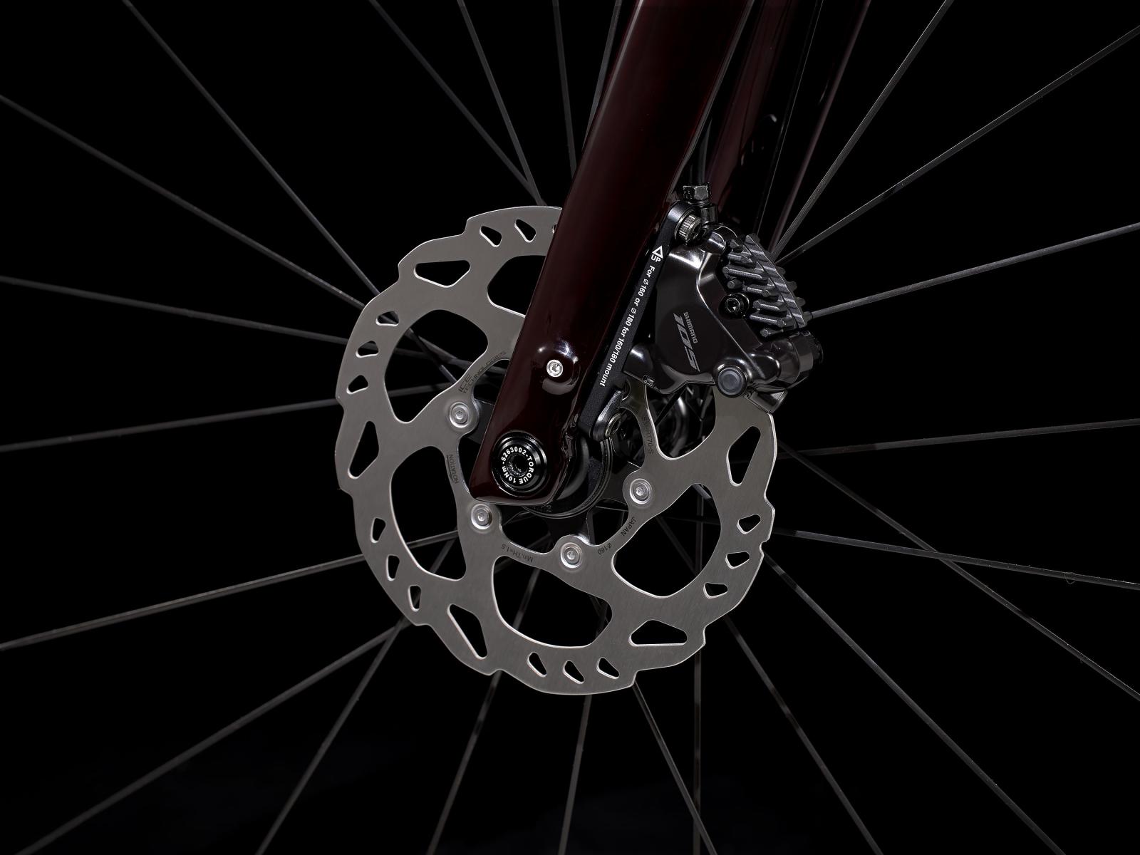 Einen Rahmen samt Gabel aus 800 Series OCLV Carbon mit hinterem IsoSpeed, internem Staufach und Befestigungsmöglichkeiten am Oberrohr. Ausgestattet ist es mit Shimanos drahtlosem, elektronischem 105 Di2 2x12-Antrieb, kraftvoll zupackenden Flat Mount-Scheibenbremsen, Aeolus Pro 37-Carbonlaufrädern und einem Bontrager Pro IsoCore-Lenker, der Straßenvibrationen im Vergleich zu herkömmlichen Carbonlenkern um 20 % verringert.
