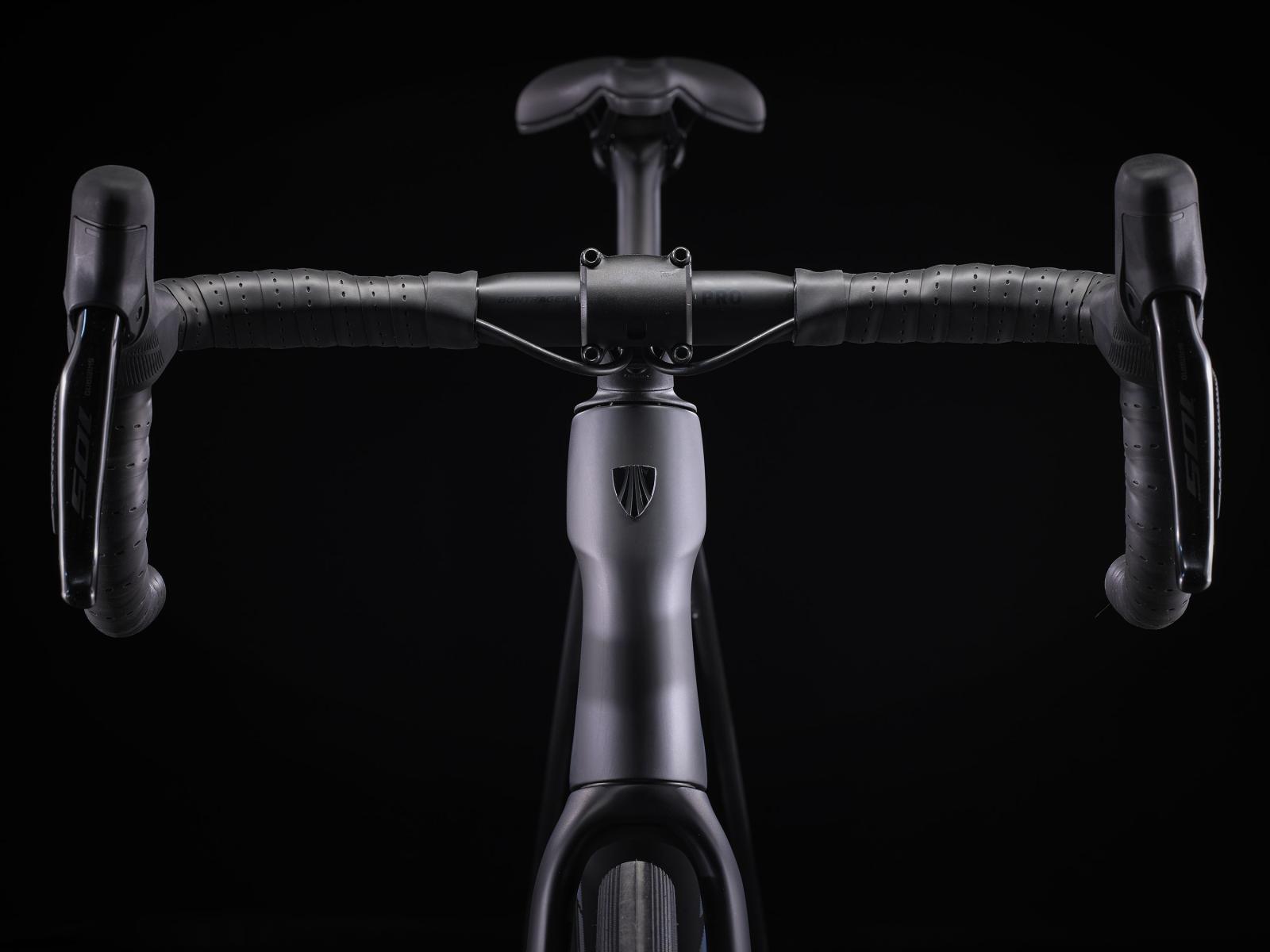 Einen Rahmen samt Gabel aus 800 Series OCLV Carbon mit hinterem IsoSpeed, internem Staufach und Befestigungsmöglichkeiten am Oberrohr. Ausgestattet ist es mit Shimanos drahtlosem, elektronischem 105 Di2 2x12-Antrieb, kraftvoll zupackenden Flat Mount-Scheibenbremsen, Aeolus Pro 37-Carbonlaufrädern und einem Bontrager Pro IsoCore-Lenker, der Straßenvibrationen im Vergleich zu herkömmlichen Carbonlenkern um 20 % verringert.