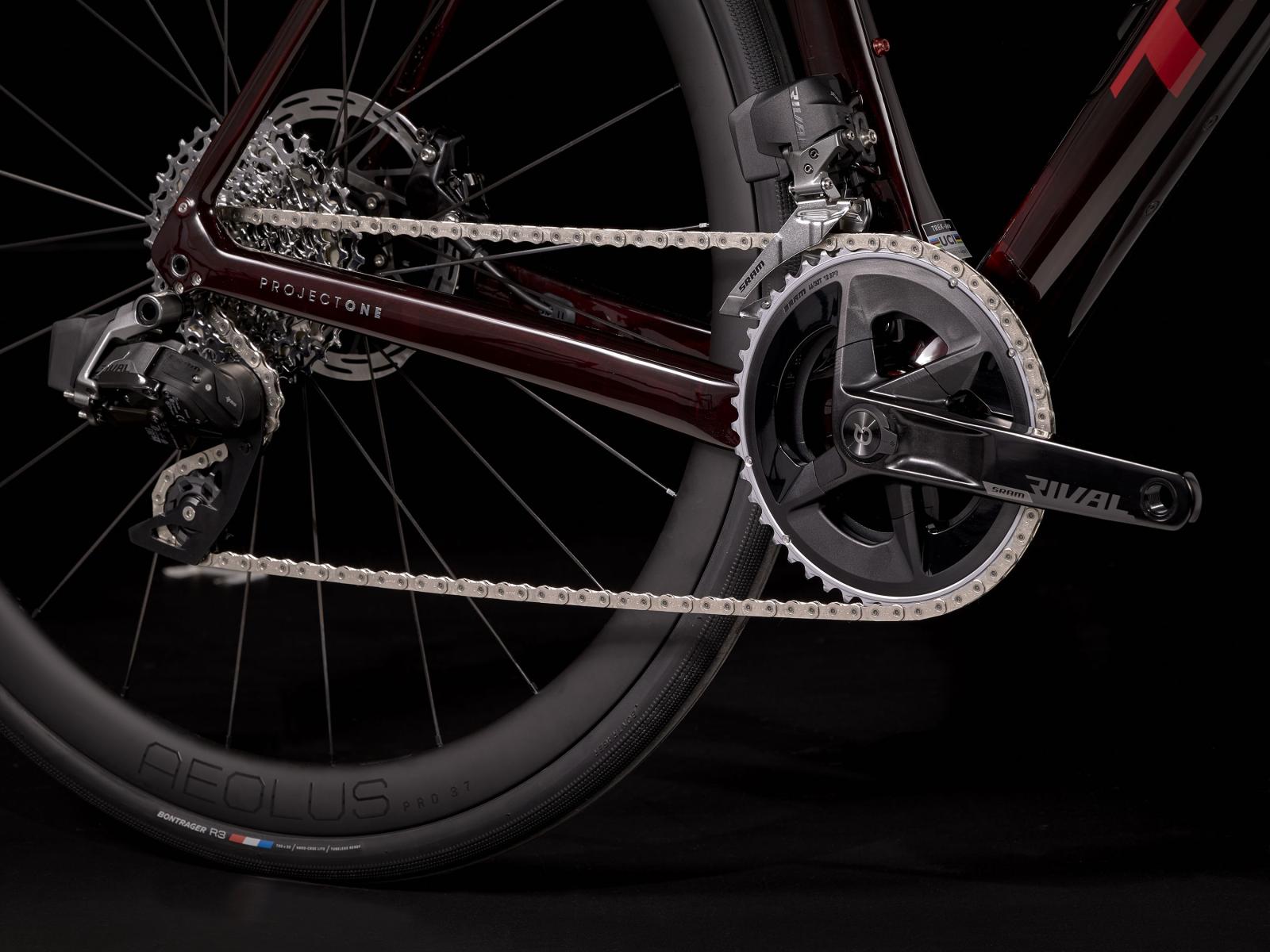 Einen Rahmen samt Gabel aus 800 Series OCLV Carbon mit hinterem IsoSpeed, internem Staufach und Befestigungsmöglichkeiten am Oberrohr. Ausgestattet ist es mit einem drahtlosen, elektronischen SRAM Rival AXS 2x12-Antrieb, einem Kurbelsatz mit integriertem Powermeter zur Verfolgung deiner Performance, kraftvoll zupackenden Flat Mount-Scheibenbremsen, Aeolus Pro 37-Carbonlaufrädern und einem Bontrager Pro IsoCore-Lenker, der Straßenvibrationen im Vergleich zu herkömmlichen Carbonlenkern um 20 % verringert.