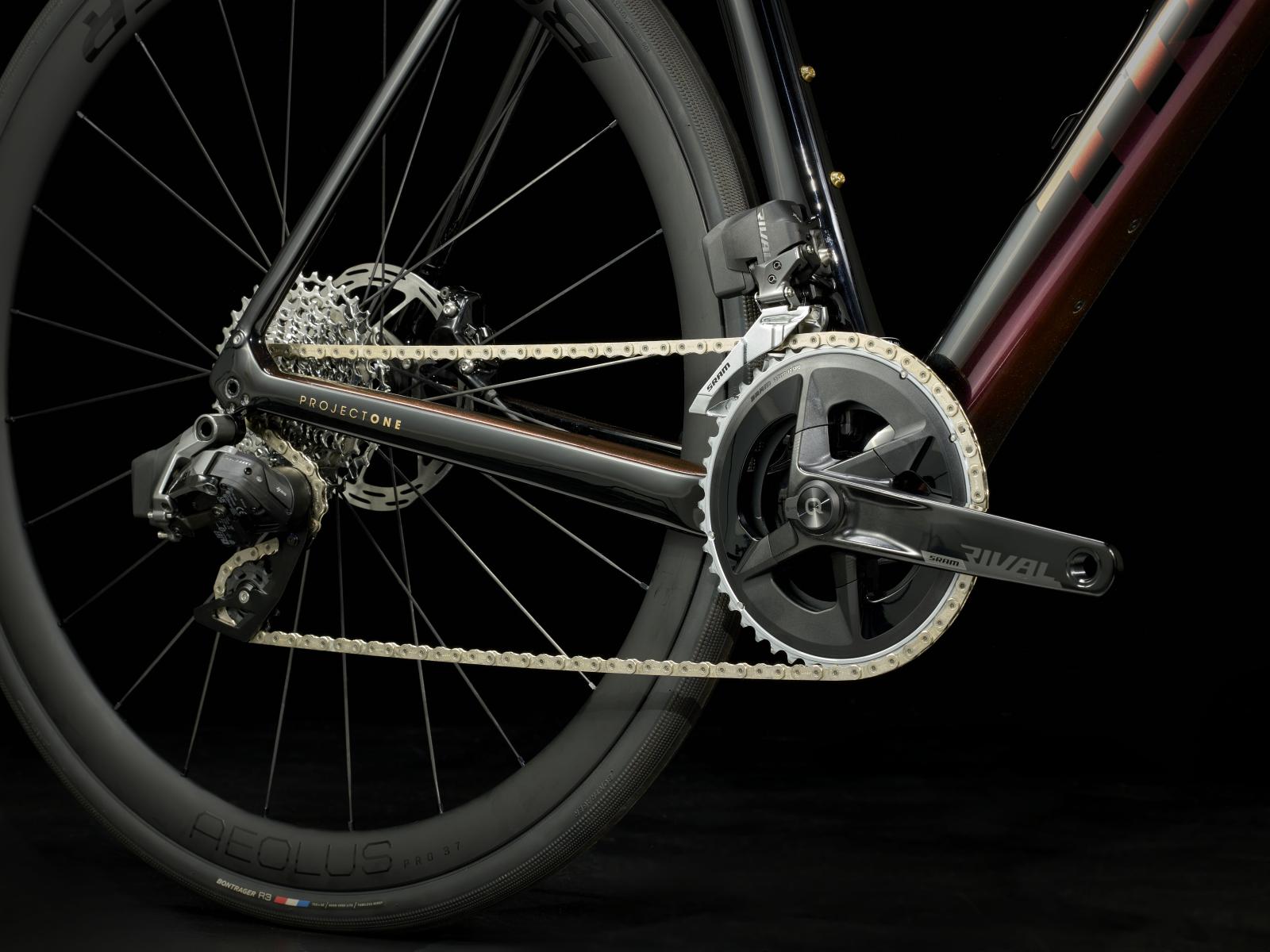 Einen Rahmen samt Gabel aus 800 Series OCLV Carbon mit hinterem IsoSpeed, internem Staufach und Befestigungsmöglichkeiten am Oberrohr. Ausgestattet ist es mit einem drahtlosen, elektronischen SRAM Rival AXS 2x12-Antrieb, einem Kurbelsatz mit integriertem Powermeter zur Verfolgung deiner Performance, kraftvoll zupackenden Flat Mount-Scheibenbremsen, Aeolus Pro 37-Carbonlaufrädern und einem Bontrager Pro IsoCore-Lenker, der Straßenvibrationen im Vergleich zu herkömmlichen Carbonlenkern um 20 % verringert.