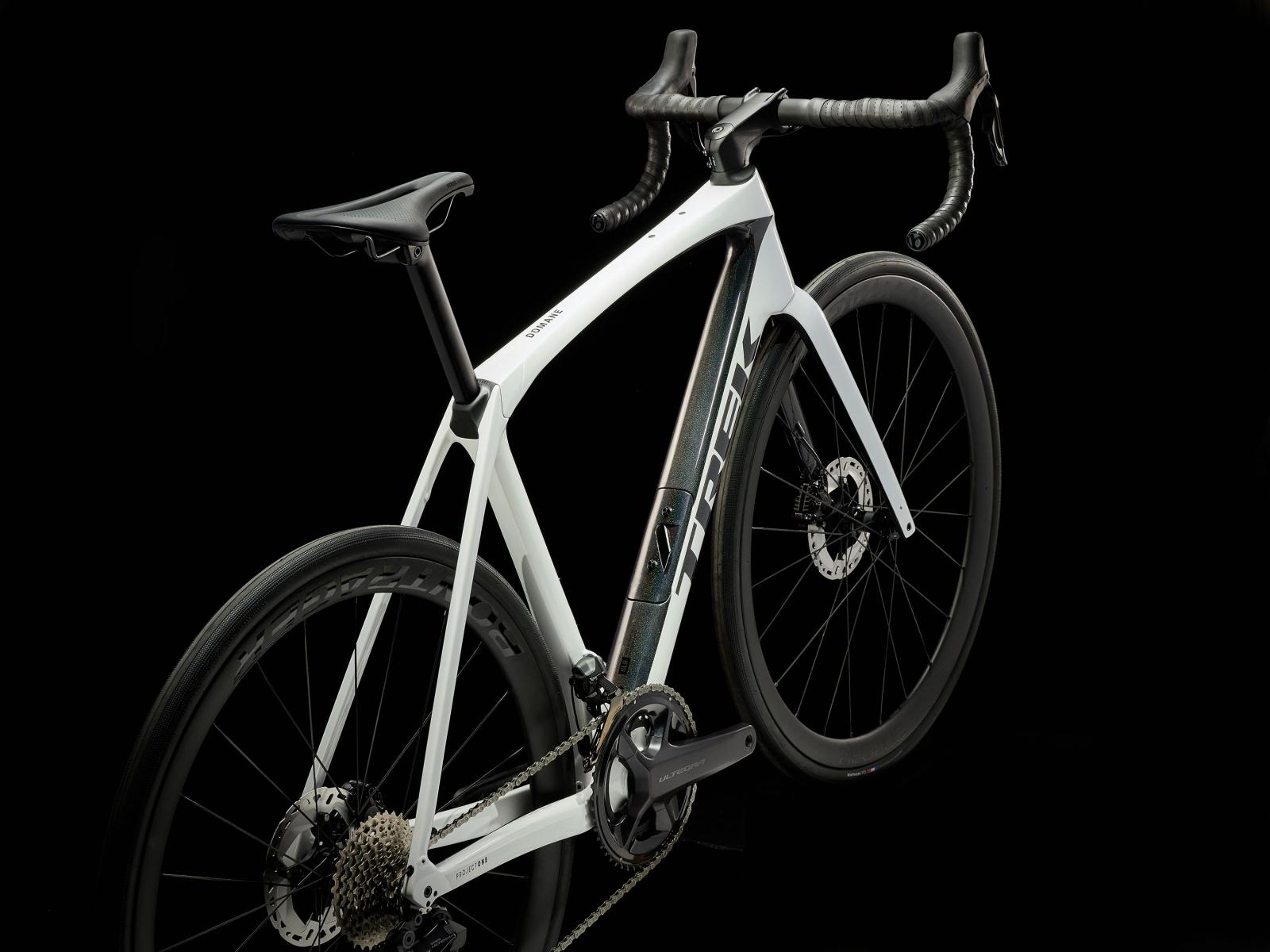 Einen Rahmen samt Gabel aus 800 Series OCLV Carbon mit hinterem IsoSpeed, integriertem internem Staufach und Befestigungsmöglichkeiten am Oberrohr. Ausgestattet ist es mit Shimanos drahtlosem, elektronischem Ultegra Di2 2x12-Antrieb, kraftvoll zupackenden Flat Mount-Scheibenbremsen, Aeolus Pro 37-Carbonlaufrädern und einem Bontrager Pro IsoCore-Lenker, der Straßenvibrationen im Vergleich zu herkömmlichen Carbonlenkern um 20 % verringert.