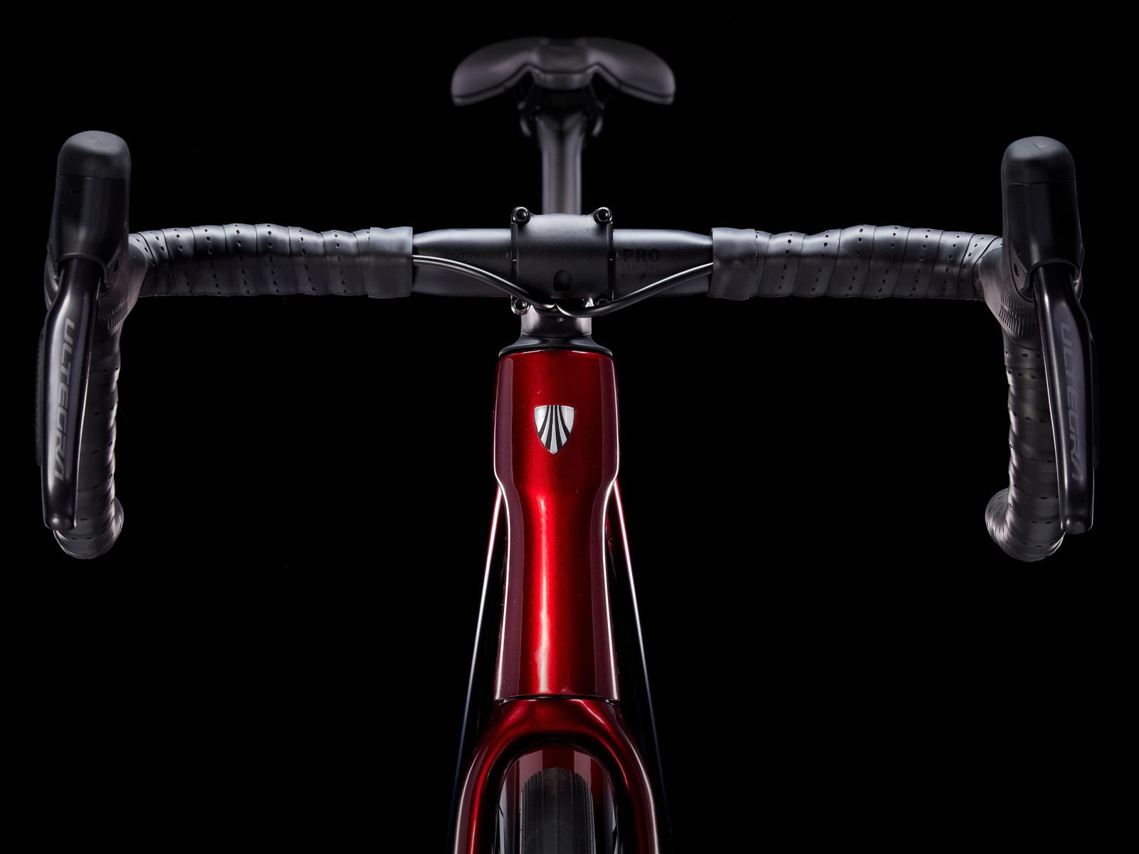 Einen Rahmen samt Gabel aus 800 Series OCLV Carbon mit hinterem IsoSpeed, integriertem internem Staufach und Befestigungsmöglichkeiten am Oberrohr. Ausgestattet ist es mit Shimanos drahtlosem, elektronischem Ultegra Di2 2x12-Antrieb, kraftvoll zupackenden Flat Mount-Scheibenbremsen, Aeolus Pro 37-Carbonlaufrädern und einem Bontrager Pro IsoCore-Lenker, der Straßenvibrationen im Vergleich zu herkömmlichen Carbonlenkern um 20 % verringert.