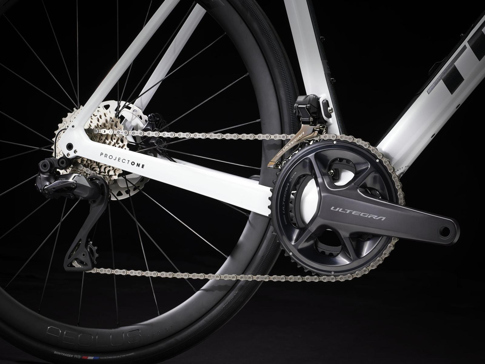 Einen Rahmen samt Gabel aus 800 Series OCLV Carbon mit hinterem IsoSpeed, integriertem internem Staufach und Befestigungsmöglichkeiten am Oberrohr. Ausgestattet ist es mit Shimanos drahtlosem, elektronischem Ultegra Di2 2x12-Antrieb, kraftvoll zupackenden Flat Mount-Scheibenbremsen, Aeolus Pro 37-Carbonlaufrädern und einem Bontrager Pro IsoCore-Lenker, der Straßenvibrationen im Vergleich zu herkömmlichen Carbonlenkern um 20 % verringert.