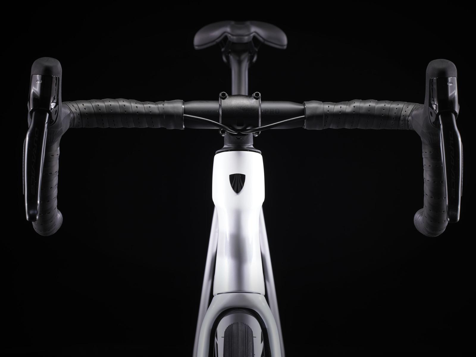 Einen Rahmen samt Gabel aus 800 Series OCLV Carbon mit hinterem IsoSpeed, internem Staufach und Befestigungsmöglichkeiten am Oberrohr. Ausgestattet ist es mit Shimanos drahtlosem, elektronischem Dura-Ace Di2 2x12-Antrieb, kraftvoll zupackenden Flat Mount Scheibenbremsen und Aeolus Pro 37 Carbonlaufrädern sowie mit einem Bontrager Pro IsoCore Lenker, der Straßenvibrationen im Vergleich zu herkömmlichen Carbonlenkern um 20 % verringert.