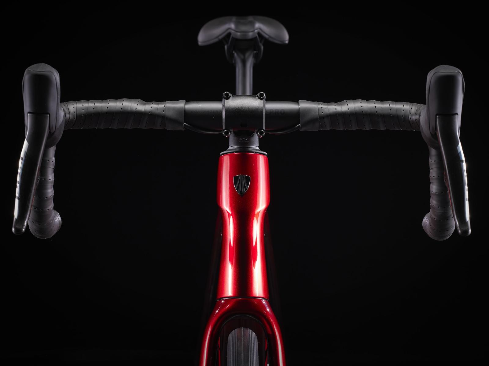 Einen Rahmen samt Gabel aus 800 Series OCLV Carbon mit hinterem IsoSpeed, internem Staufach und Befestigungsmöglichkeiten am Oberrohr. Ausgestattet ist es mit einem drahtlosen, elektronischen SRAM RED AXS-Antrieb, einem Kurbelsatz mit integriertem Powermeter zur Überwachung deiner Performance, kraftvoll zupackenden Flat Mount-Scheibenbremsen, Aeolus Pro 37-Carbonlaufrädern und einem Bontrager Pro IsoCore-Lenker, der Straßenvibrationen im Vergleich zu herkömmlichen Carbonlenkern um 20 % verringert.
