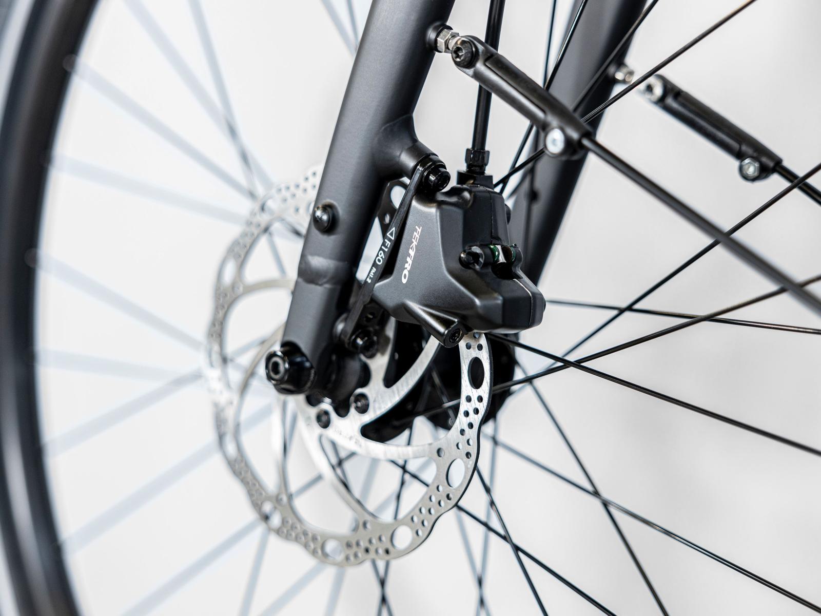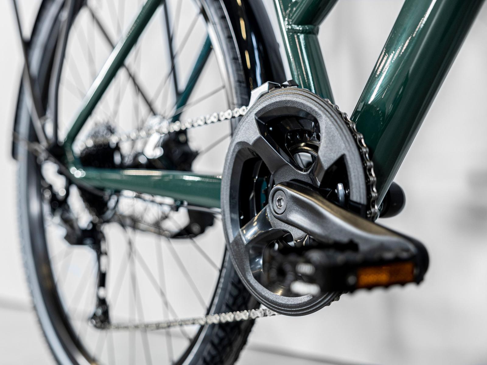 Einen leichten Aluminiumrahmen mit tiefem Durchstieg und interner Zugführung für einen sauberen Look, 650B-Laufräder mit breiten 50C-Reifen zur Verbesserung der Geländegängigkeit und des Komforts in abwechslungsreichem Terrain, eine zuverlässige 2x9-Schaltung von Shimano mit breitem Übersetzungsspektrum, komfortable ergonomische Griffe, kraftvolle hydraulische Scheibenbremsen für zuverlässige Bremsleistung bei jeder Witterung, einen MIK-kompatiblen Gepäckträger, Beleuchtung, Schutzbleche und einen Seitenständer.
