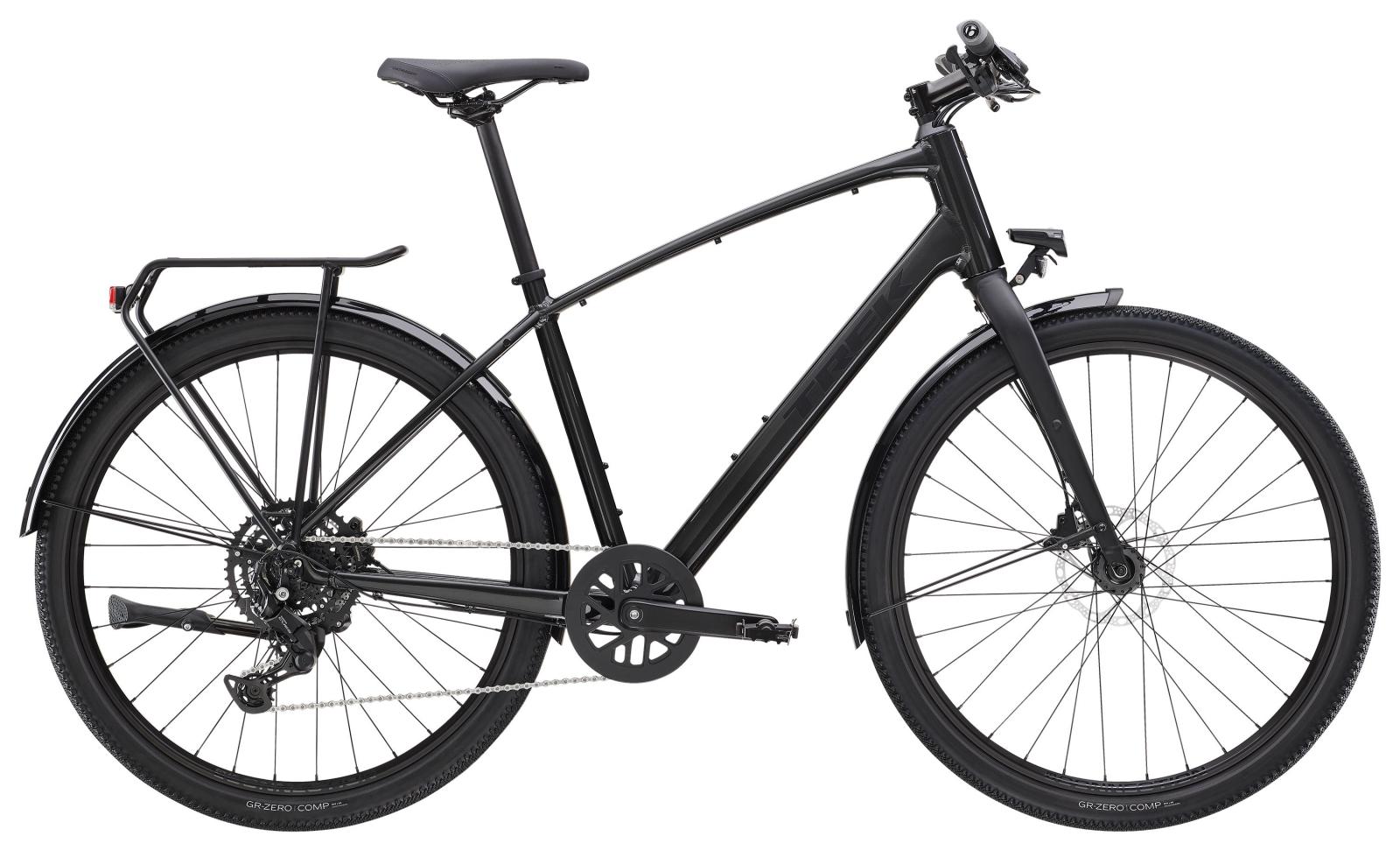 Einen leichten Aluminiumrahmen mit interner Zugführung für einen sauberen Look, 650B-Laufräder mit breiten 50C-Reifen zur Verbesserung der Geländegängigkeit und des Komforts in abwechslungsreichem Terrain, eine zuverlässige Shimano CUES 1x9-Schaltung mit breitem Übersetzungsbereich, komfortable ergonomische Griffe, kraftvolle hydraulische Scheibenbremsen für zuverlässige Bremsleistung bei jeder Witterung, einen MIK-kompatiblen Gepäckträger, Beleuchtung, Schutzbleche und einen Seitenständer.