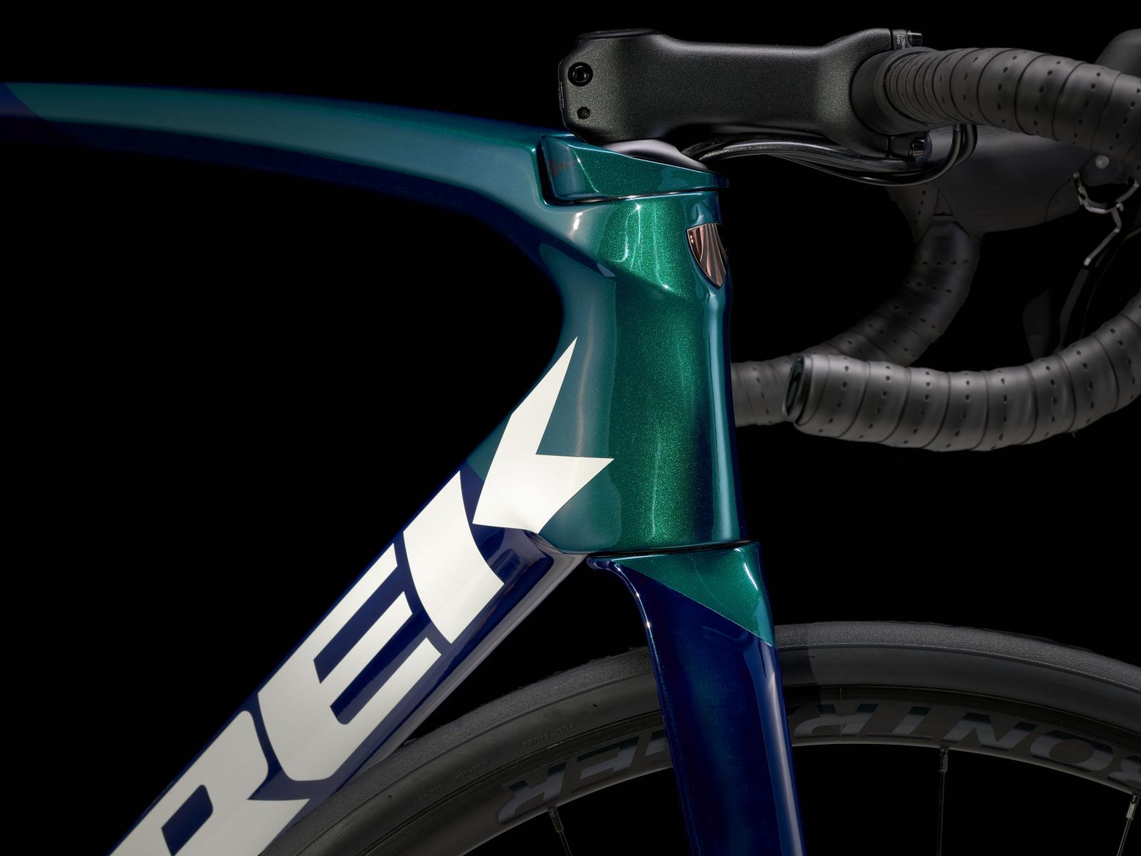 Einen leichten, aerodynamischen Rahmen samt Gabel aus 500 Series OCLV Carbon, einen kompletten Shimano 105 12fach-Antrieb, kraftvolle hydraulische Flat Mount Scheibenbremsen von Shimano, innen verlegte Züge und Bontrager Paradigm SL Tubeless-Ready-Laufräder.