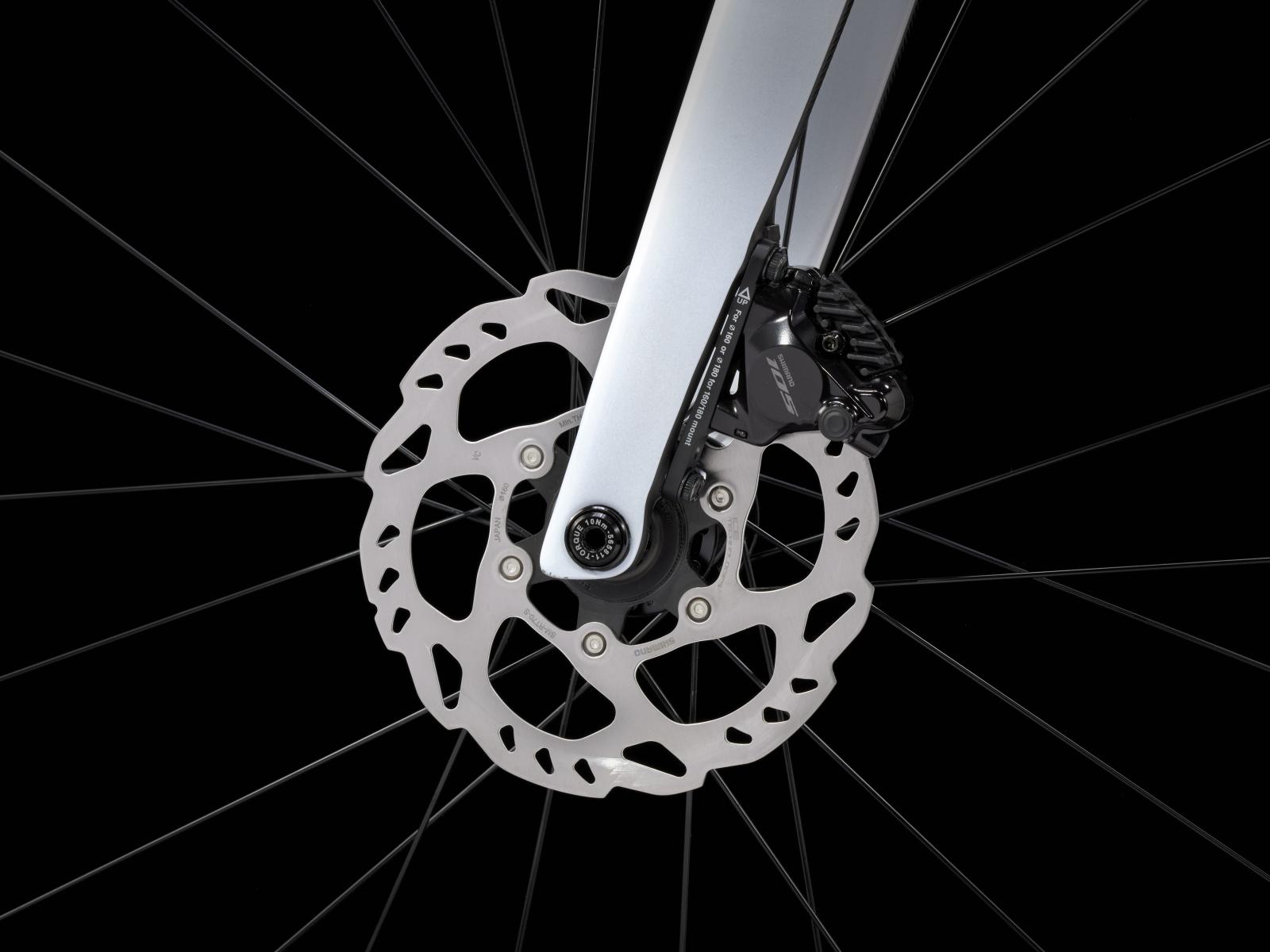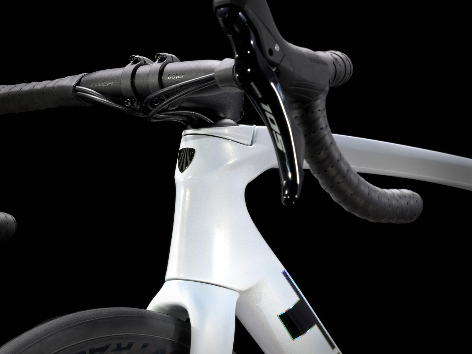 Einen leichten, aerodynamischen Rahmen samt Gabel aus 500 Series OCLV Carbon, einen kompletten Shimano 105 12fach-Antrieb, kraftvolle hydraulische Flat Mount Scheibenbremsen von Shimano, innen verlegte Züge und Bontrager Paradigm SL Tubeless-Ready-Laufräder.