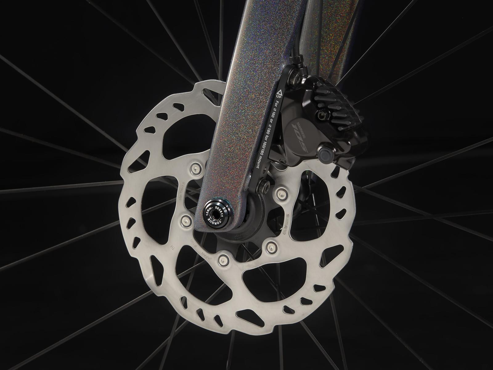 Einen ultraleichten und aerodynamischen Rahmen aus 800 Series OCLV Carbon mit weniger als 700 Gramm Gewicht, eine Vollcarbongabel, einen drahtlosen, elektronischen Shimano 105 Di2 2x12-Antrieb, leichte Bontrager Aeolus Pro 37 Tubeless Ready-Laufräder aus OCLV Carbon, eine integrierte Aeolus RSL Lenker/Vorbau-Einheit aus OCLV Carbon und kraftvoll zupackende hydraulische Scheibenbremsen.