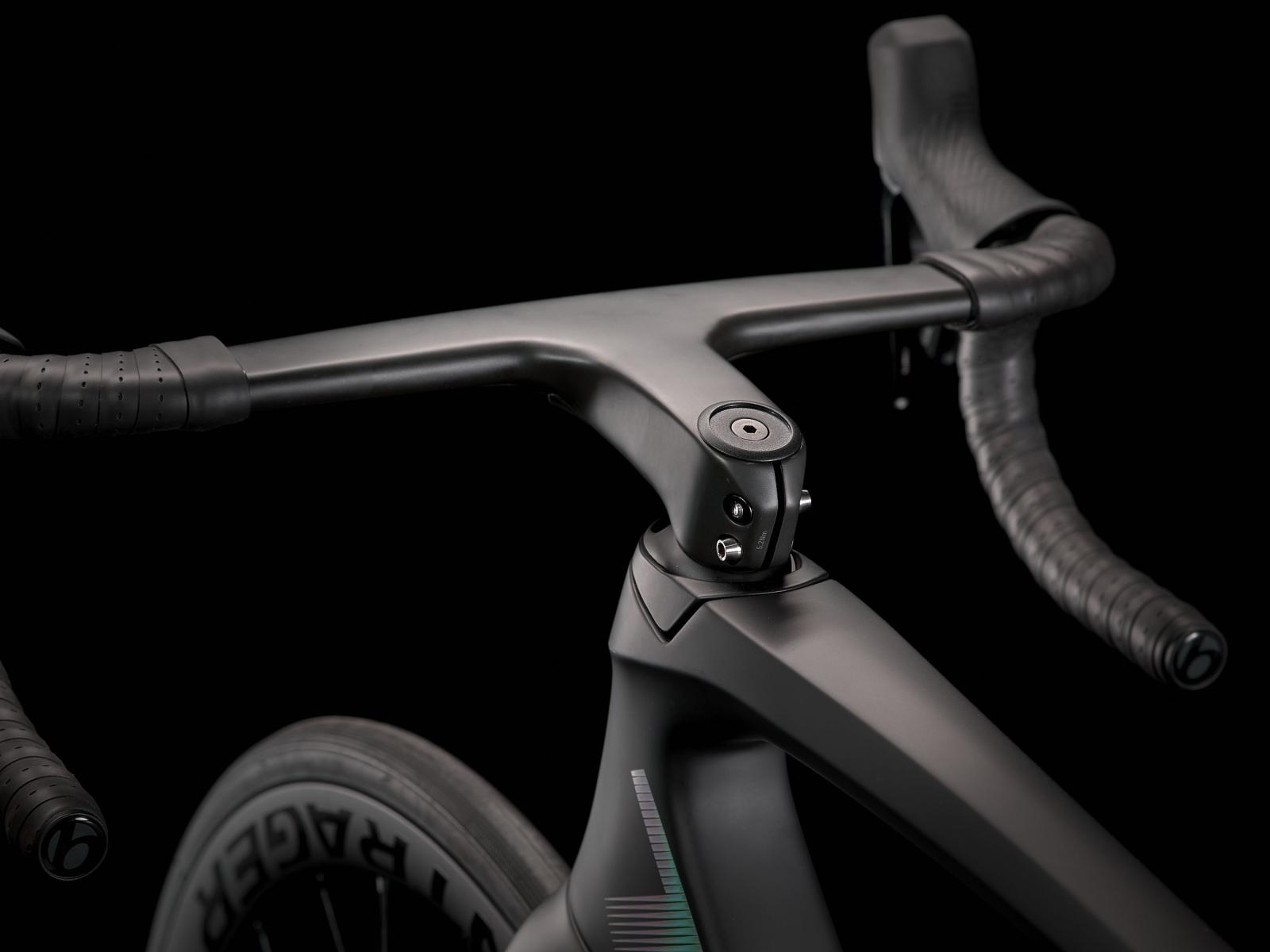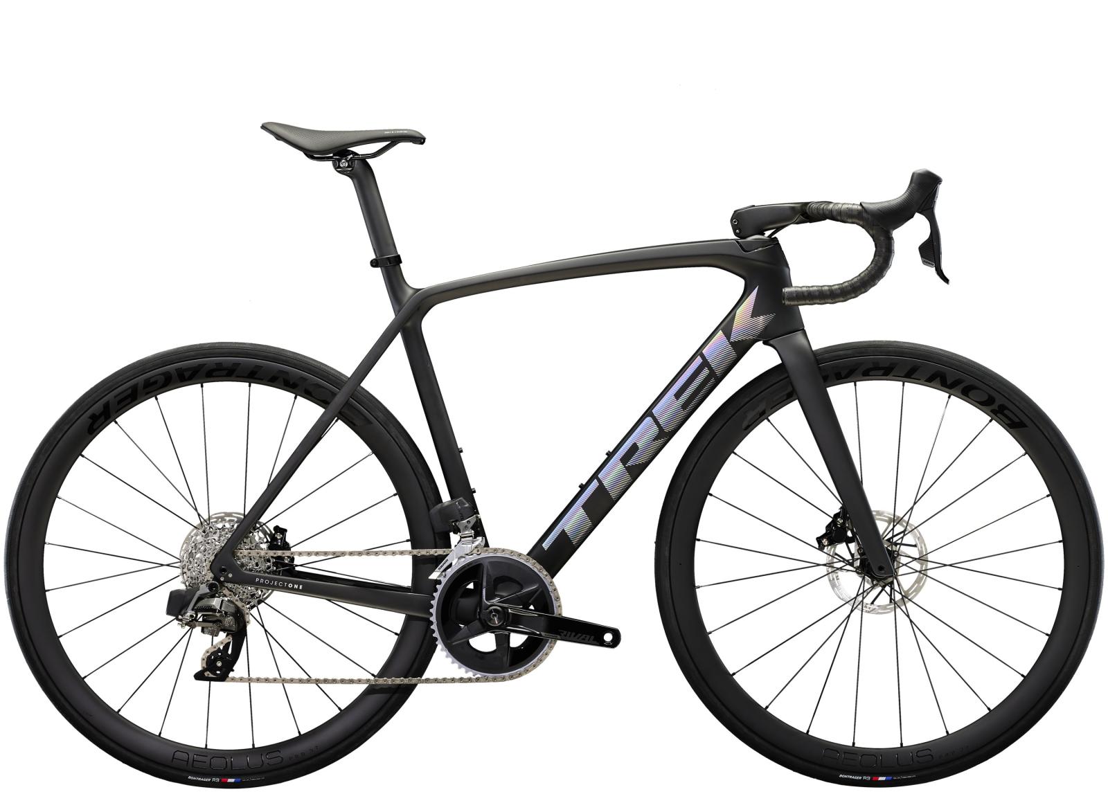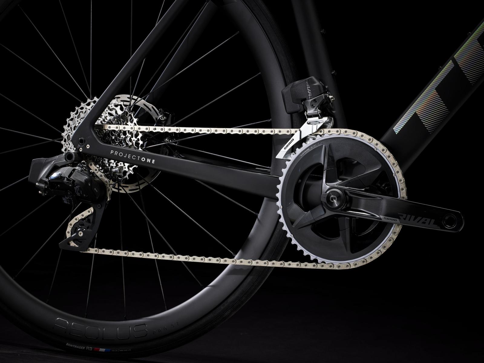 Einen ultraleichten und aerodynamischen Rahmen aus 800 Series OCLV Carbon, der weniger als 700 Gramm auf die Waage bringt, einen drahtlosen, elektronischen SRAM Rival AXS-Antrieb samt Rival AXS-Powermeter, leichte Bontrager Aeolus Pro 37 Tubeless Ready-Laufräder aus OCLV Carbon, eine integrierte Aeolus RSL Lenker/Vorbau-Einheit aus OCLV Carbon und kraftvoll zupackende hydraulische Scheibenbremsen.