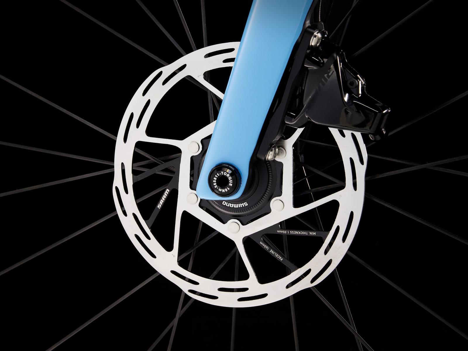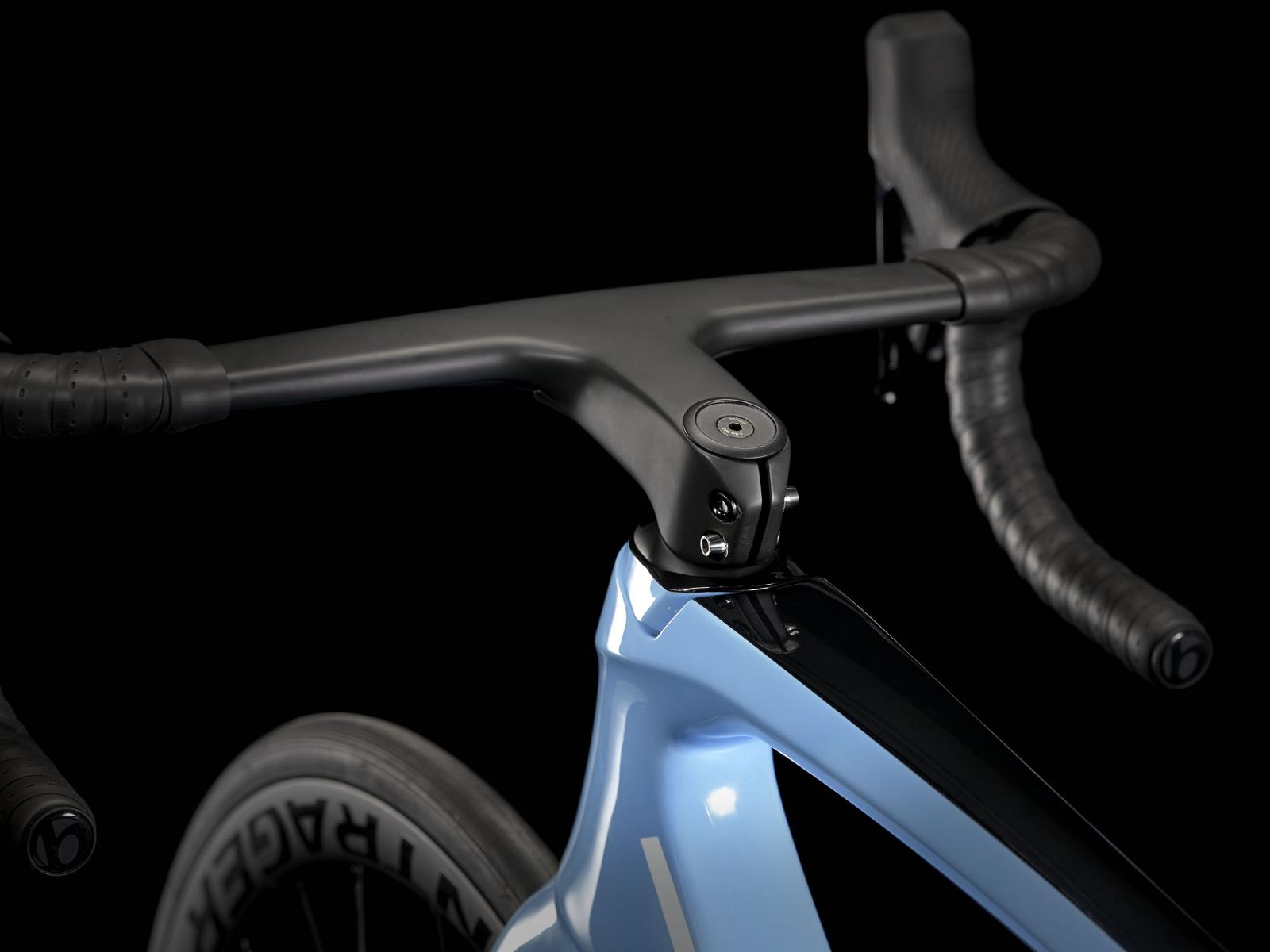 Einen ultraleichten und aerodynamischen Rahmen aus 800 Series OCLV Carbon, der weniger als 700 Gramm auf die Waage bringt, einen drahtlosen, elektronischen SRAM Rival AXS-Antrieb samt Rival AXS-Powermeter, leichte Bontrager Aeolus Pro 37 Tubeless Ready-Laufräder aus OCLV Carbon, eine integrierte Aeolus RSL Lenker/Vorbau-Einheit aus OCLV Carbon und kraftvoll zupackende hydraulische Scheibenbremsen.