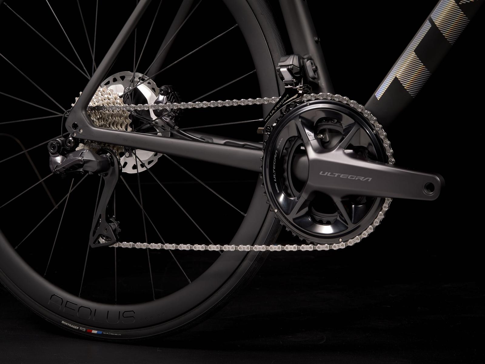 Einen ultraleichten und aerodynamischen Rahmen aus 800 Series OCLV Carbon mit weniger als 700 Gramm Gewicht, eine Vollcarbongabel, einen drahtlosen elektronischen Shimano Ultegra Di2 2x12-Antrieb, leichte Bontrager Aeolus Pro 37 Tubeless Ready-Laufräder aus OCLV Carbon, eine integrierte Aeolus RSL Lenker/Vorbau-Einheit aus OCLV Carbon und kraftvoll zupackende hydraulische Scheibenbremsen.