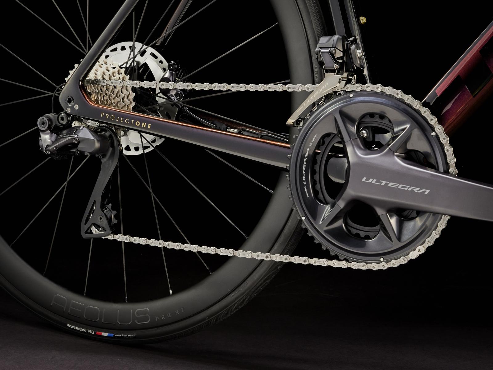Einen ultraleichten und aerodynamischen Rahmen aus 800 Series OCLV Carbon mit weniger als 700 Gramm Gewicht, eine Vollcarbongabel, einen drahtlosen elektronischen Shimano Ultegra Di2 2x12-Antrieb, leichte Bontrager Aeolus Pro 37 Tubeless Ready-Laufräder aus OCLV Carbon, eine integrierte Aeolus RSL Lenker/Vorbau-Einheit aus OCLV Carbon und kraftvoll zupackende hydraulische Scheibenbremsen.