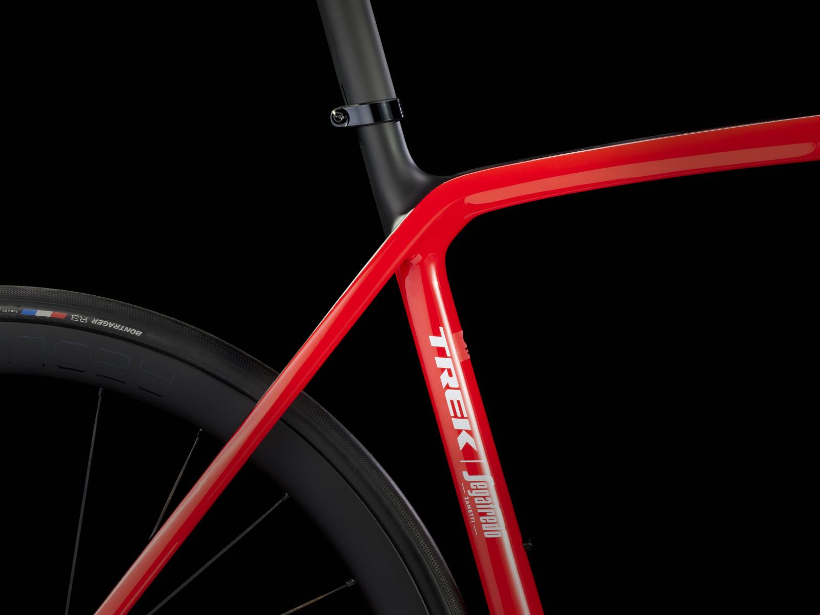Einen ultraleichten, aerodynamischen Rahmen aus 800 Series OCLV Carbon, der weniger als 700 Gramm auf die Waage bringt, einen drahtlosen, elektronischen SRAM Force AXS D2 2x12-Antrieb, leichte Bontrager Aeolus Pro 37 Tubeless Ready-Laufräder aus OCLV Carbon, eine integrierte Aeolus RSL Lenker/Vorbau-Einheit aus OCLV Carbon, einen SRAM Force AXS-Powermeter und kraftvoll zupackende hydraulische Scheibenbremsen.