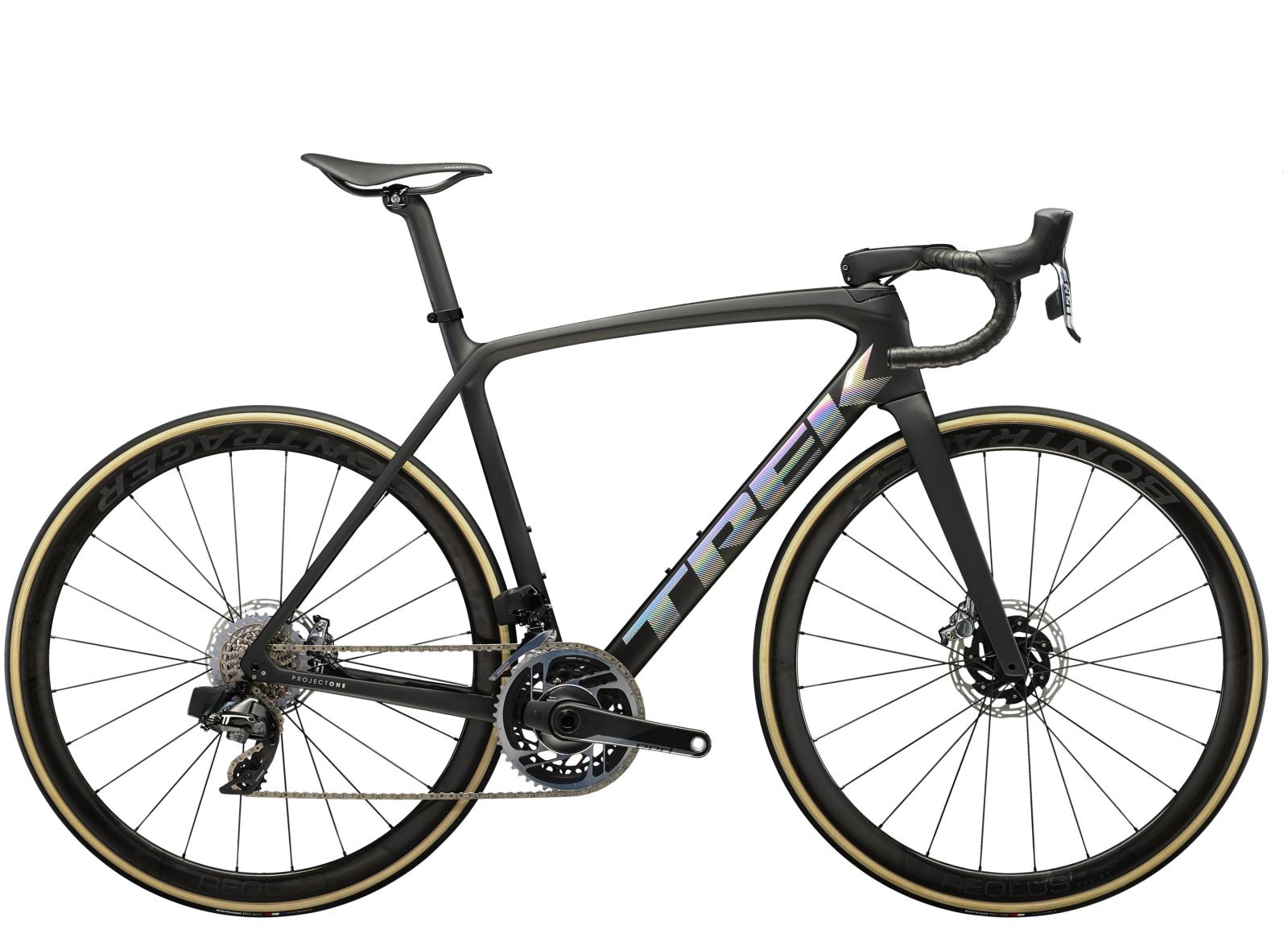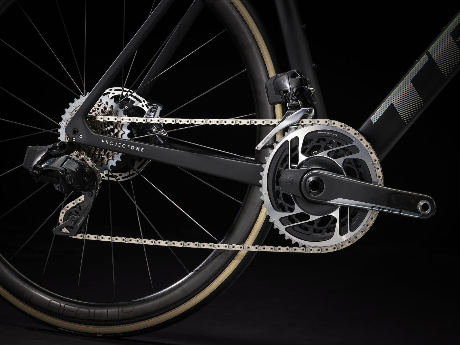 Einen ultraleichten und aerodynamischen Rahmen aus 800 Series OCLV Carbon, der weniger als 700 Gramm auf die Waage bringt, einen SRAM RED AXS 2x12-Antrieb mit drahtloser, elektronischer Schaltung, ultraleichte, schnelle und stabile Bontrager Aeolus RSL 37 Tubeless Ready-Laufräder aus OCLV Carbon, eine integrierte Aeolus RSL Lenker/Vorbau-Einheit aus OCLV Carbon, einen SRAM RED AXS-Powermeter und kraftvoll zupackende hydraulische Scheibenbremsen.