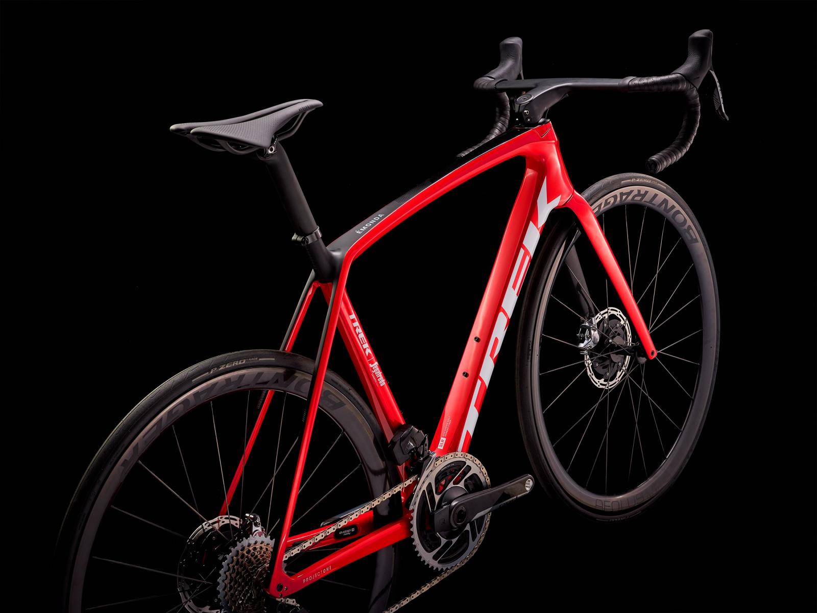Einen ultraleichten und aerodynamischen Rahmen aus 800 Series OCLV Carbon, der weniger als 700 Gramm auf die Waage bringt, einen SRAM RED AXS 2x12-Antrieb mit drahtloser, elektronischer Schaltung, ultraleichte, schnelle und stabile Bontrager Aeolus RSL 37 Tubeless Ready-Laufräder aus OCLV Carbon, eine integrierte Aeolus RSL Lenker/Vorbau-Einheit aus OCLV Carbon, einen SRAM RED AXS-Powermeter und kraftvoll zupackende hydraulische Scheibenbremsen.