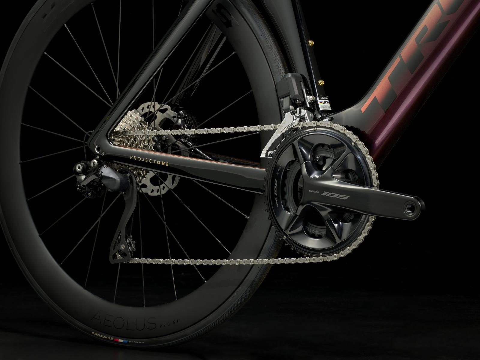 Einen leichten Rahmen aus unserem 800 Series OCLV Carbon mit aerodynamischen Rohrprofilen, aerodynamischer und vibrationsdämpfender IsoFlow-Technologie und unsichtbarer Zugführung. Außerdem bekommst du Shimanos neuen drahtlosen, elektronischen Shimano 105-Antrieb, hydraulische Flat Mount-Scheibenbremsen, Bontragers Aeolus Pro 51 Tubeless Ready-Carbonlaufräder und eine integrierte Lenker/Vorbau-Einheit aus OCLV Carbon.