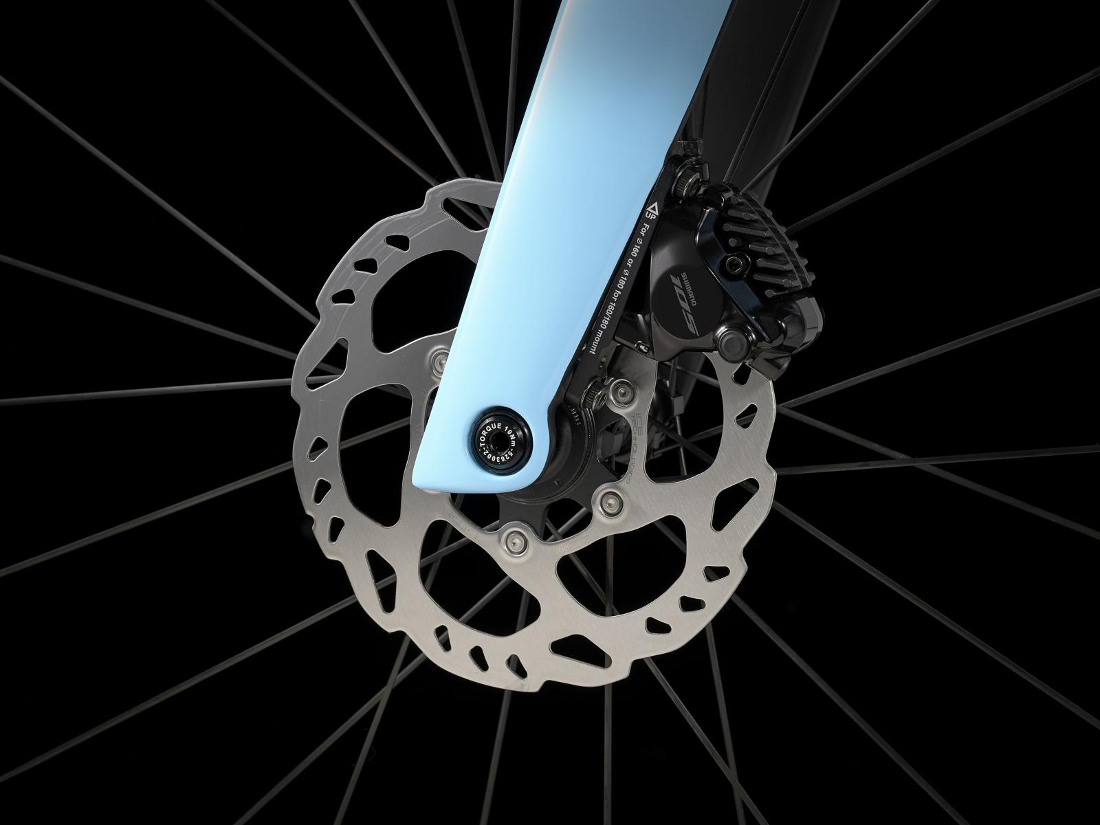 Gabel: Madone, Vollcarbon mit KVF-Profil, konischer Carbongabelschaft, interne Bremszugführung, Flat Mount-Scheibenbremsaufnahme, Carbonausfallenden, 12 x 100 mm Steckachse