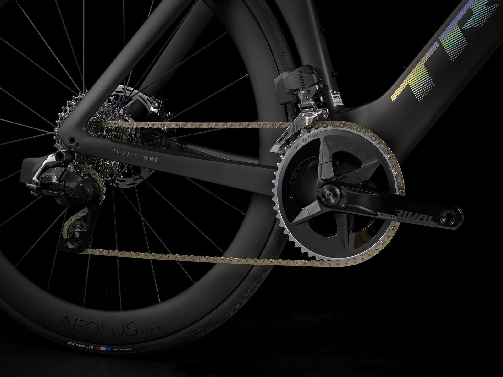 Einen leichten Rahmen aus unserem besten 800 Series OCLV Carbon mit komplett neuen aerodynamischen Kammtail-Rohrprofilen, aerodynamischer und vibrationsdämpfender IsoFlow-Technologie und unsichtbarer Zugführung. Außerdem bekommst du einen drahtlosen, elektronischen SRAM Rival AXS-Antrieb, hydraulische Flat Mount-Scheibenbremsen, einen Kurbelsatz mit integriertem Powermeter zur Überwachung deiner Performance, Bontragers Aeolus Pro 51 Tubeless Ready-Carbonlaufräder und eine integrierte Lenker/Vorbau-Kombination aus OCLV Carbon.