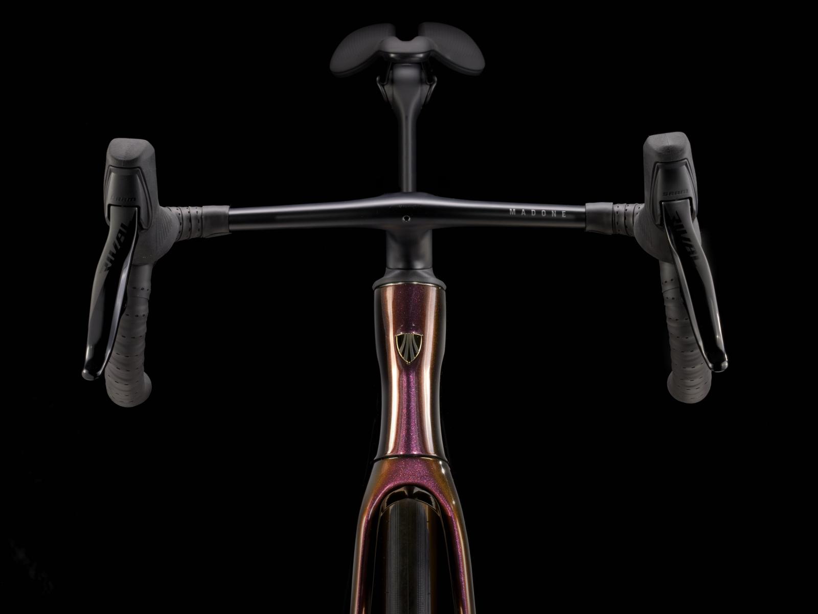 Lenker: Madone Integrierte Lenker/Vorbau-Einheit, OCLV Carbon, 80 mm Reach, 124 mm Drop, 39 cm Bremsgriffabstand, 42 cm Unterlenkerbreite, 100 mm Vorbaulänge