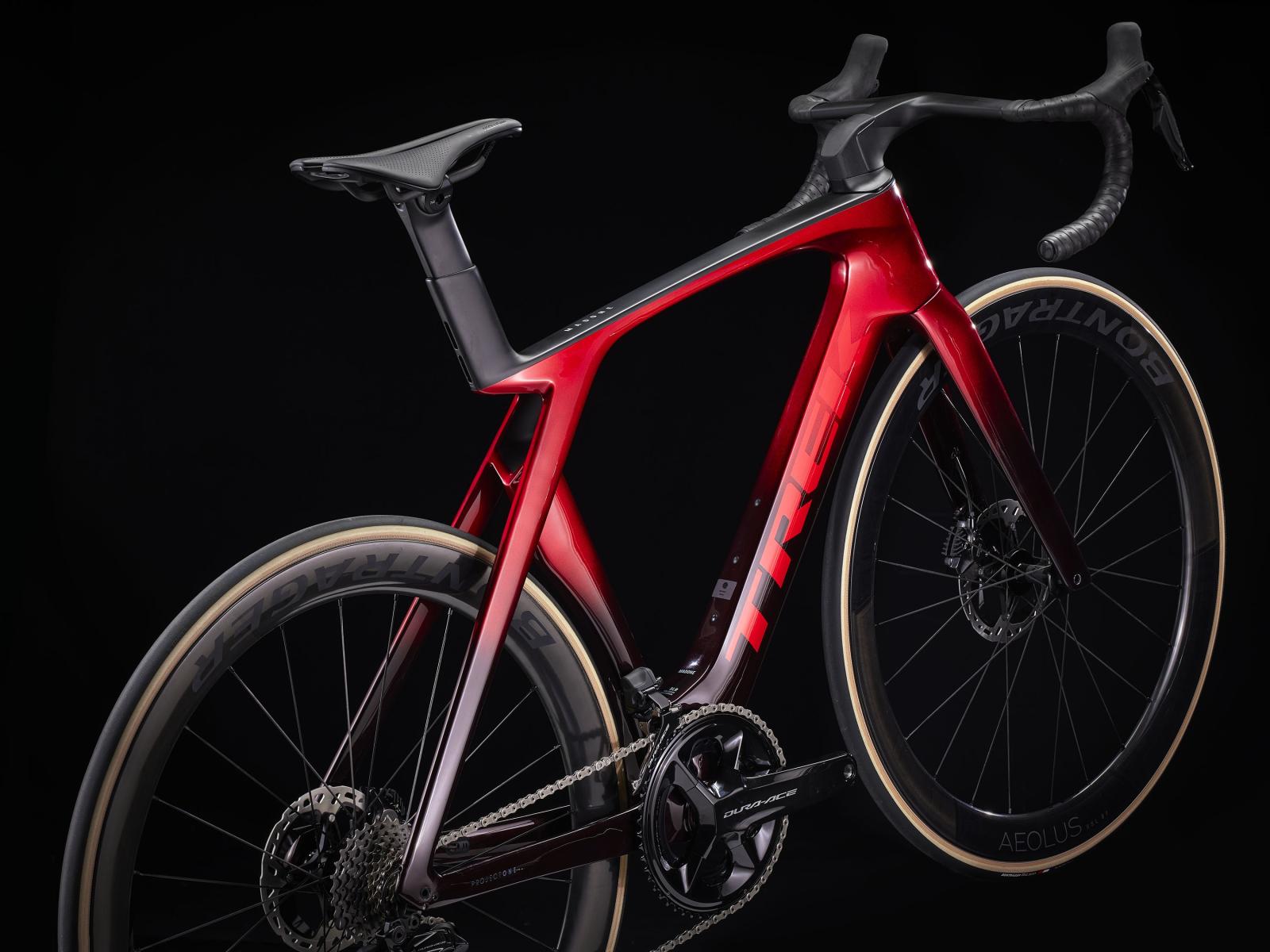 Einen leichten Rahmen aus unserem besten 800 Series OCLV Carbon mit neuen aerodynamischen Kammtail Virtual Foil-Rohrprofilen (KVF), aerodynamischer und vibrationsdämpfender IsoFlow-Technologie und unsichtbarer Zugführung. Außerdem bekommst du einen drahtlosen, elektronischen Shimano Dura-Ace Di2 2x12-Antrieb, hydraulische Flat Mount Scheibenbremsen, Bontragers Aeolus RSL 51 Tubeless-Ready-Carbonlaufräder und eine integrierte Lenker/Vorbau-Einheit aus OCLV Carbon.