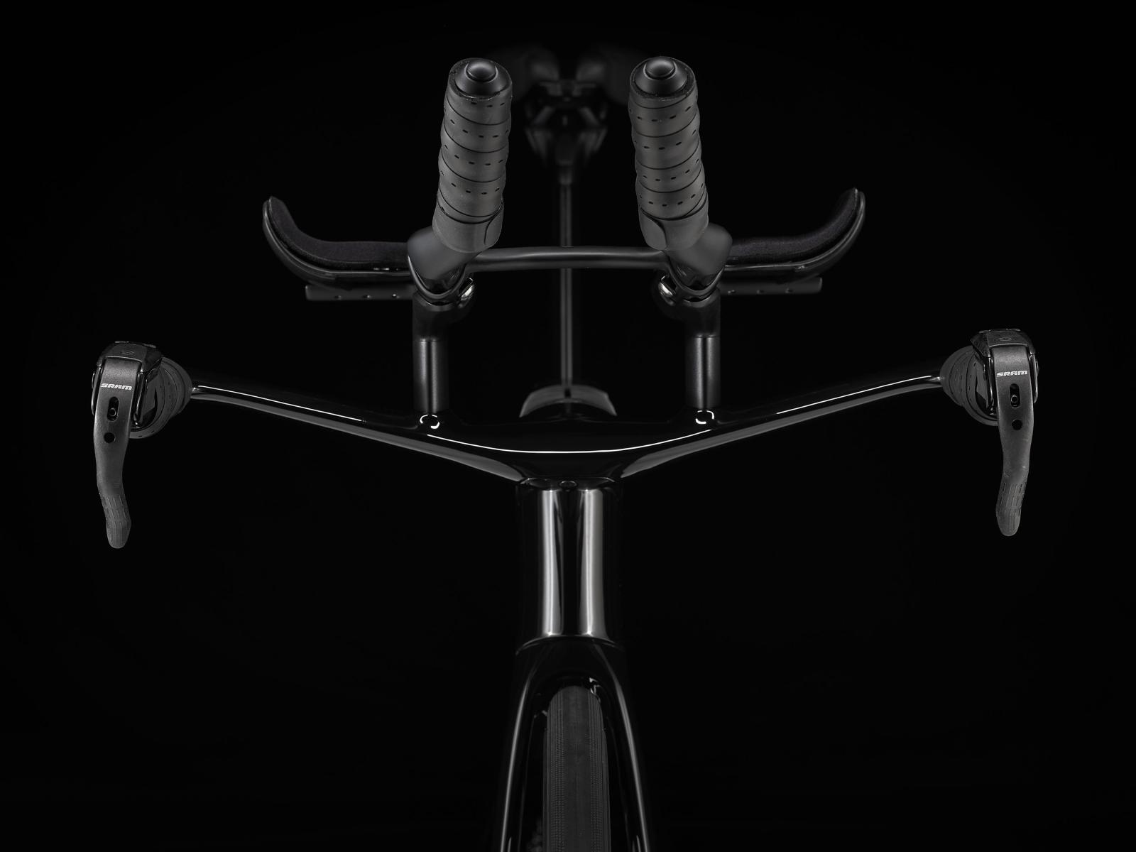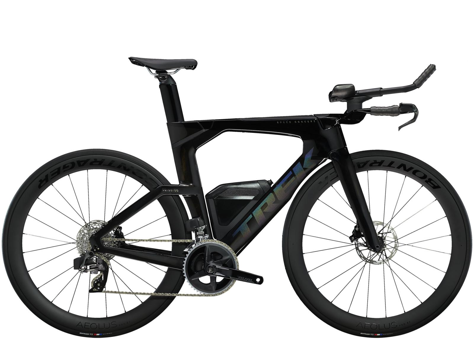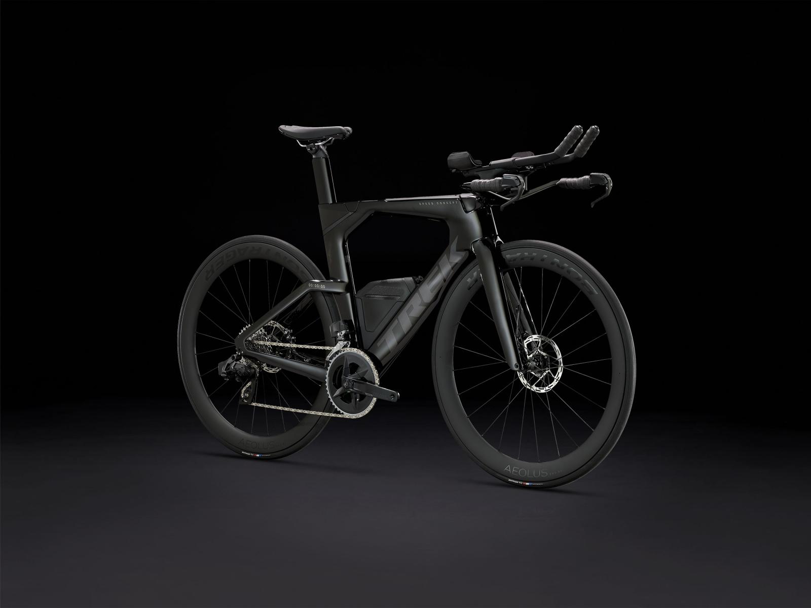 Einen ultraleichten Rahmen aus 800 Series OCLV Carbon, windschnittige Rohre mit Kammtail Virtual Foil-Profil (KVF), eine Speed Concept-Carbongabel mit aerodynamischem Profil, vibrationsdämpfendes IsoSpeed, integrierte aerodynamische Aufbewahrungslösungen für Verpflegung, Flüssigkeit und Pannenkit, einen drahtlosen, elektronischen SRAM Rival AXS 12fach-Antrieb mit SRAM AXS-Blips-Schalthebeln für eine aerodynamische Sitzposition beim Schalten, einen Rival AXS-Powermeter, einen vollständig integrierten Lenker samt Vorbau, einen triathlonspezifischen Bontrager Hilo Comp-Sattel für eine aggressive Aero-Sitzposition, zuverlässig zupac