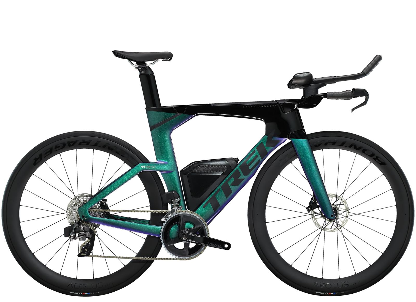 Einen ultraleichten Rahmen aus 800 Series OCLV Carbon, windschnittige Rohre mit Kammtail Virtual Foil-Profil (KVF), eine Speed Concept-Carbongabel mit aerodynamischem Profil, vibrationsdämpfendes IsoSpeed, integrierte aerodynamische Aufbewahrungslösungen für Verpflegung, Flüssigkeit und Pannenkit, einen drahtlosen, elektronischen SRAM Rival AXS 12fach-Antrieb mit SRAM AXS-Blips-Schalthebeln für eine aerodynamische Sitzposition beim Schalten, einen Rival AXS-Powermeter, einen vollständig integrierten Lenker samt Vorbau, einen triathlonspezifischen Bontrager Hilo Comp-Sattel für eine aggressive Aero-Sitzposition, zuverlässig zupac