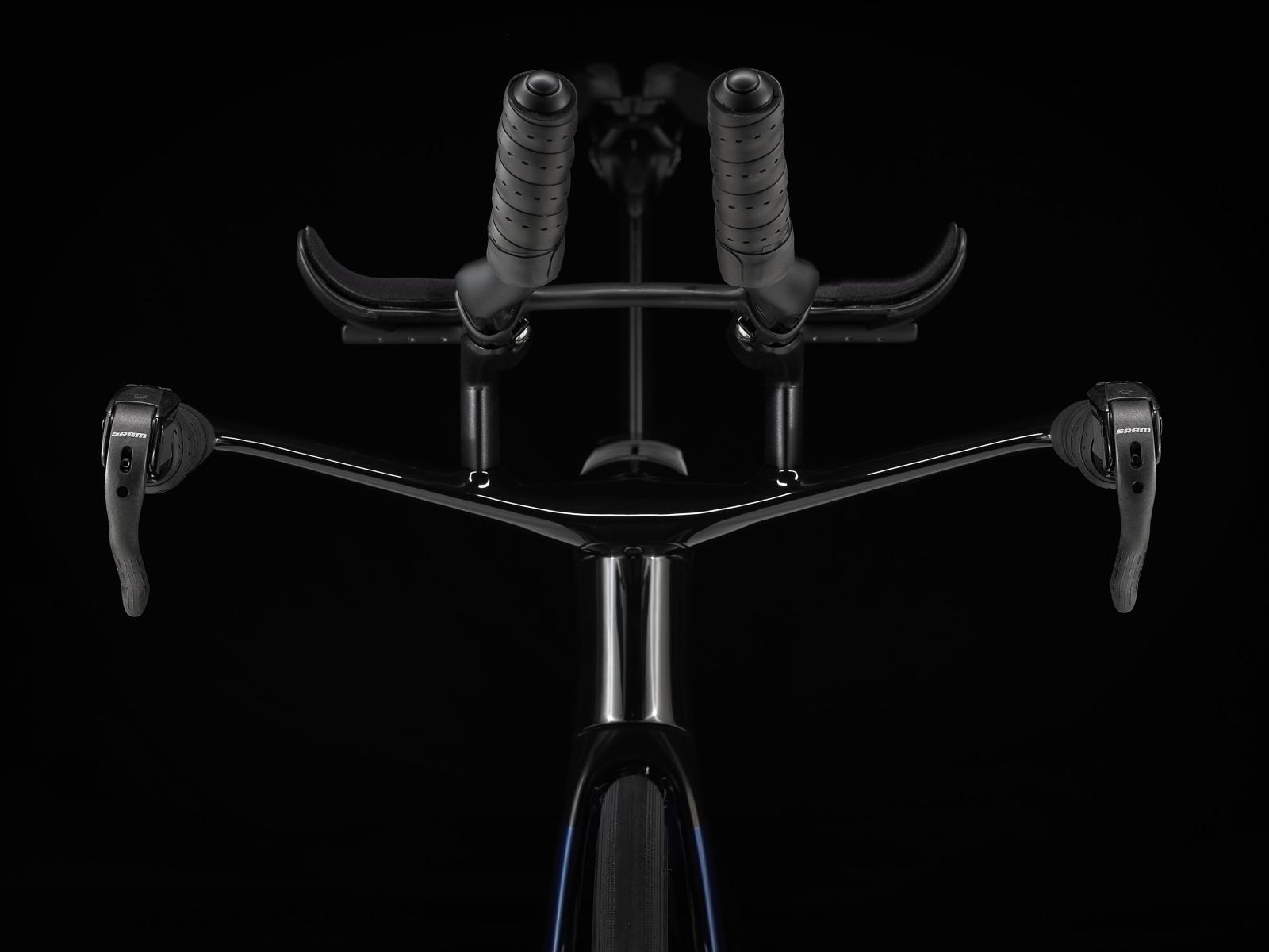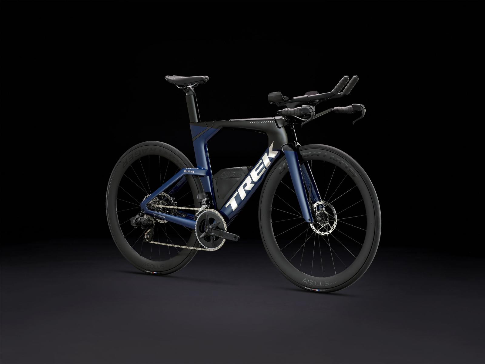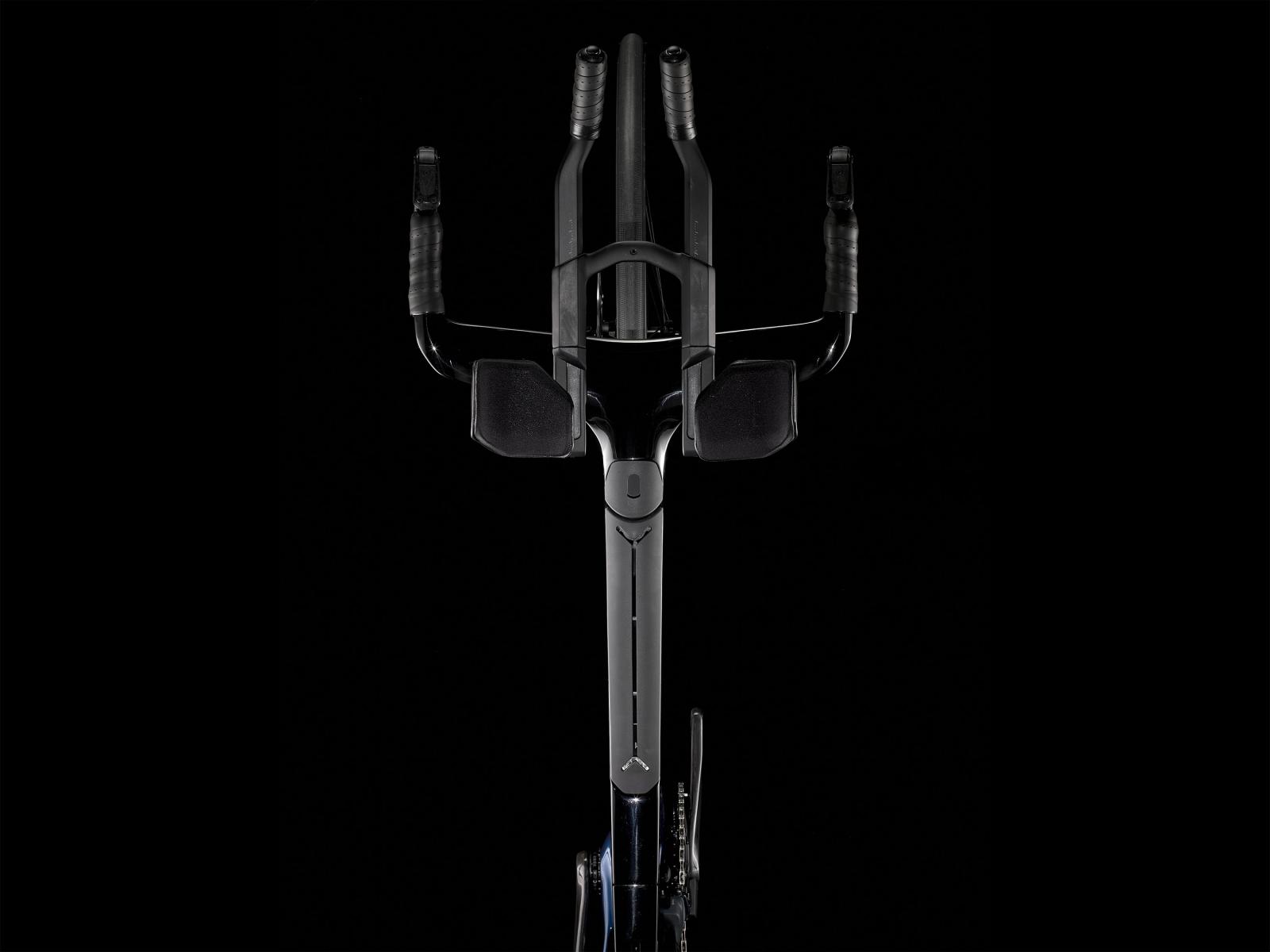 Einen ultraleichten Rahmen aus 800 Series OCLV Carbon, windschnittige Rohre mit Kammtail Virtual Foil-Profil (KVF), eine Speed Concept-Carbongabel mit aerodynamischem Profil, vibrationsdämpfendes IsoSpeed, integrierte aerodynamische Aufbewahrungslösungen für Verpflegung, Flüssigkeit und Pannenkit, einen drahtlosen, elektronischen SRAM Rival AXS 12fach-Antrieb mit SRAM AXS-Blips-Schalthebeln für eine aerodynamische Sitzposition beim Schalten, einen Rival AXS-Powermeter, einen vollständig integrierten Lenker samt Vorbau, einen triathlonspezifischen Bontrager Hilo Comp-Sattel für eine aggressive Aero-Sitzposition, zuverlässig zupac