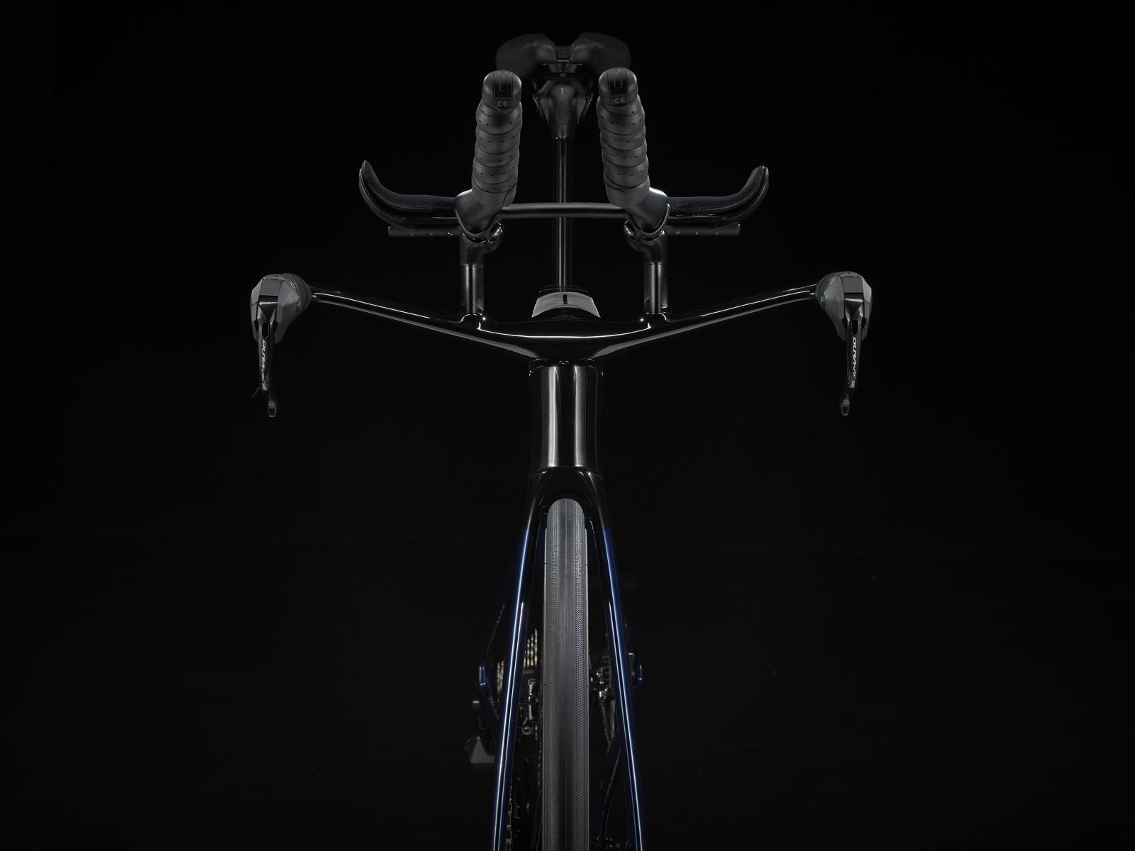 Einen ultraleichten Rahmen aus 800 Series OCLV Carbon, windschnittige Rohre mit Kammtail Virtual Foil Profil (KVF), eine Speed Concept Carbongabel mit aerodynamischem Profil, vibrationsdämpfendes IsoSpeed und integrierte Aufbewahrungslösungen für Verpflegung, Flüssigkeit und Pannenkit. Dazu gibt es einen drahtlosen, elektronischen Shimano Ultegra Di2 12fach-Antrieb, eine vollständig integrierte Lenker/Vorbau-Einheit, einen triathlonspezifischen Bontrager Hilo Comp Sattel für eine aggressive Aero-Sitzposition, Scheibenbremsen für zuverlässige Bremsleistung und Bontrager Aeolus Pro 51 Laufräder aus OCLV Carbon.
