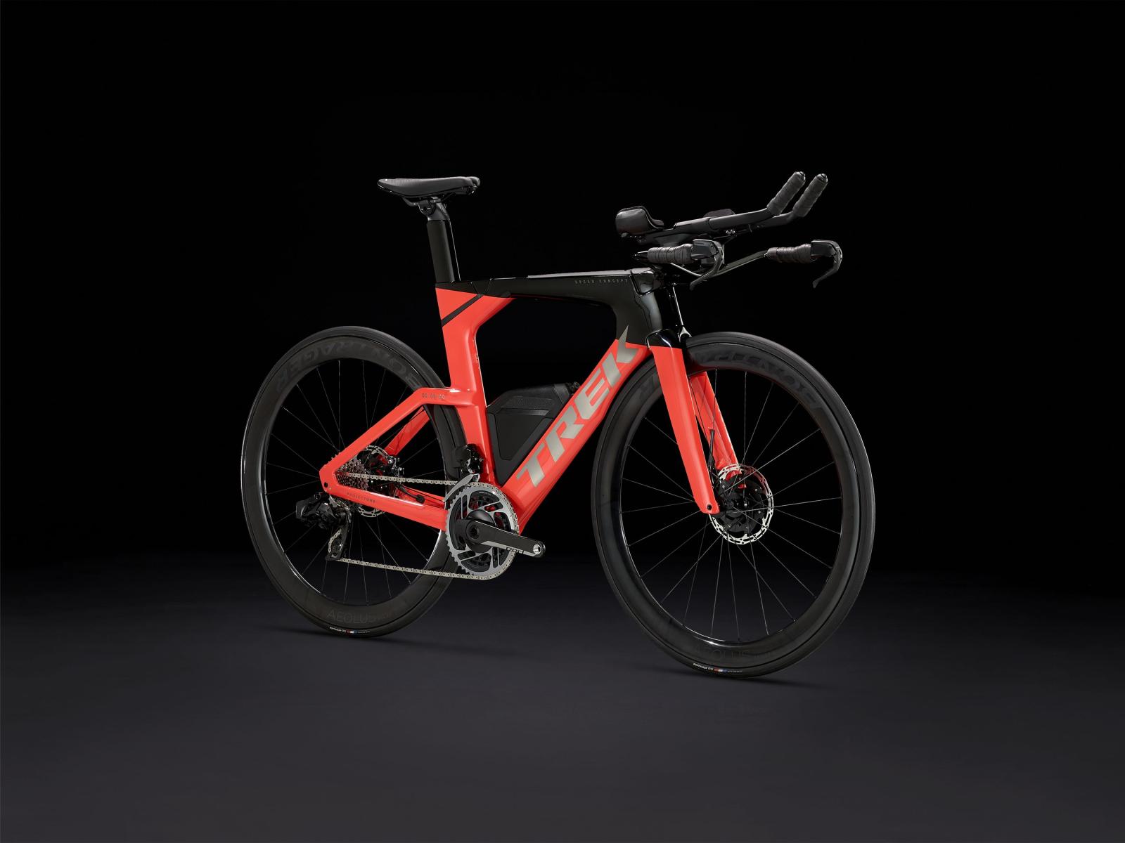 Einen ultraleichten Rahmen aus 800 Series OCLV Carbon, windschnittige Rohre mit Kammtail Virtual Foil-Profil (KVF), eine Speed Concept-Carbongabel mit aerodynamischem Profil, straßenglättendes IsoSpeed, integrierte Aufbewahrungslösungen für Verpflegung, Flüssigkeit und ein Pannenkit, einen drahtlosen elektronischen SRAM RED AXS 12fach-Antrieb mit SRAM AXS Blips-Schalthebeln, einen SRAM RED AXS-Powermeter, einen vollständig integrierten Lenker samt Vorbau, einen triathlonspezifischen Bontrager Hilo Pro-Carbonsattel für eine aggressive Aero-Sitzposition, zuverlässig zupackende Scheibenbremsen und aerodynamische Bontrager Aeolus RS