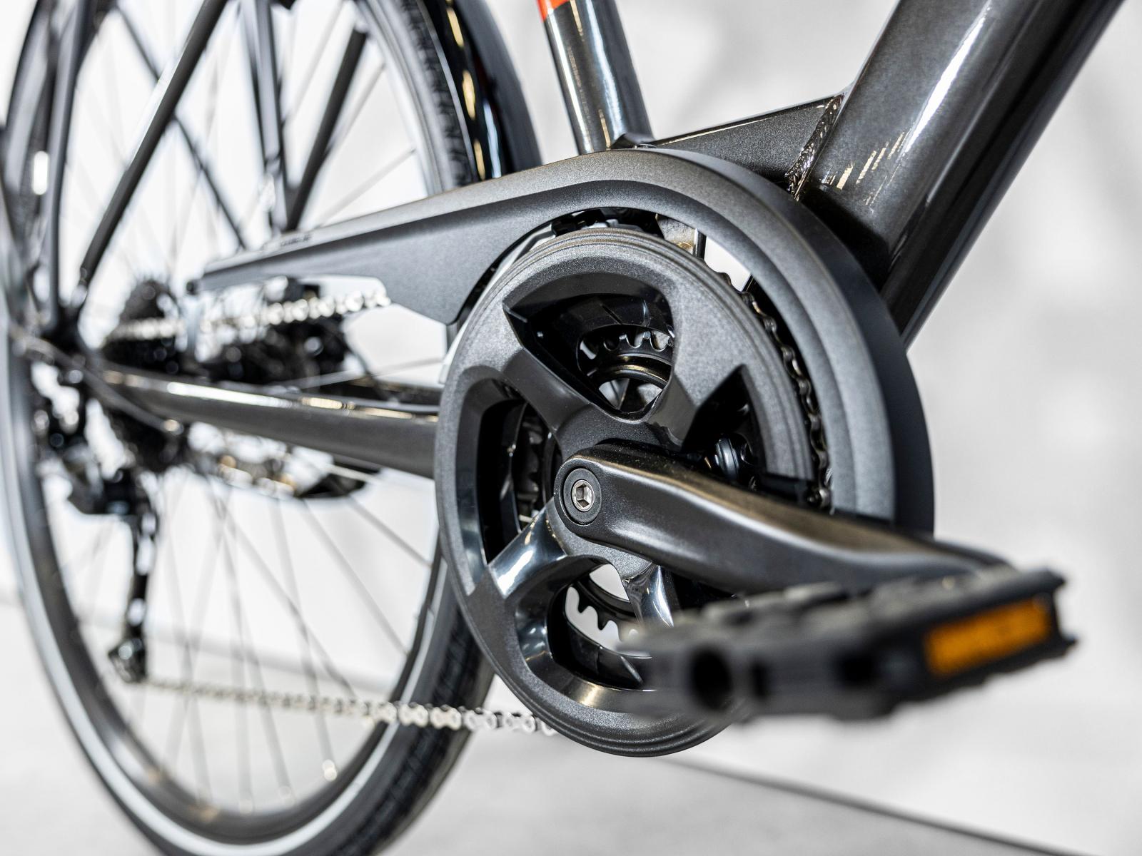 Einen leichten Aluminiumrahmen mit tiefem Durchstieg und einer Geometrie, die eine komfortable, aufrechte Sitzhaltung ermöglicht. Dazu gibt es einen zuverlässigen Antrieb mit 18 Gängen für eine stets optimale Trittfrequenz, kraftvolle hydraulische Scheibenbremsen, einen verstellbaren Vorbau, einen gepolsterten Sattel, ergonomische Griffe, reflektierende, breite 40C-Reifen für mehr Stabilität, eine stoßdämpfende Federgabel, eine gefederte Sattelstütze und eine über einen 3 Watt starken Nabendynamo gespeiste Beleuchtung. Zudem kommt es ab Werk mit viel praktischem Zubehör, wie etwa Schutzblechen, Beleuchtung, Seitenständer, Schlos